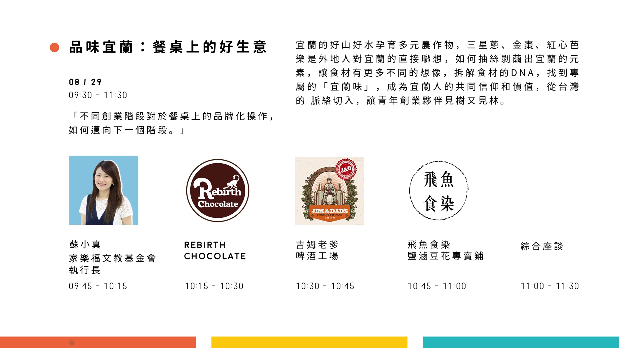 ●活動好康 凡報名場次一「品味宜蘭:餐桌上的好生意」、場次二「挑剔宜蘭:食旅體驗好生活」可獲得限量手搖杯飲料提袋,及場次三「對話宜蘭:江振誠與他的初心」入場抽獎資格。