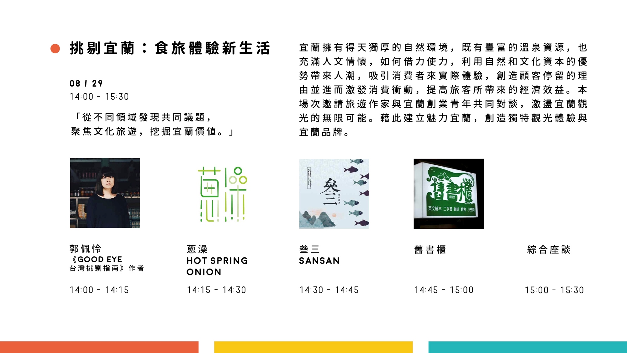 宜蘭擁有得天獨厚的自然環境,既有豐富的溫泉資源,也充滿人文情懷,如何借力使力,利用自然和文化資本的優勢帶來人潮,吸引消費者來實際體驗,創造顧客停留的理由並進而激發消費衝動,提高旅客所帶來的經濟效益。本場次邀請旅遊作家與宜蘭創業青年共同對談,激盪宜蘭觀光的無限可能。藉此建立魅力宜蘭,創造獨特觀光體驗與宜蘭品牌。