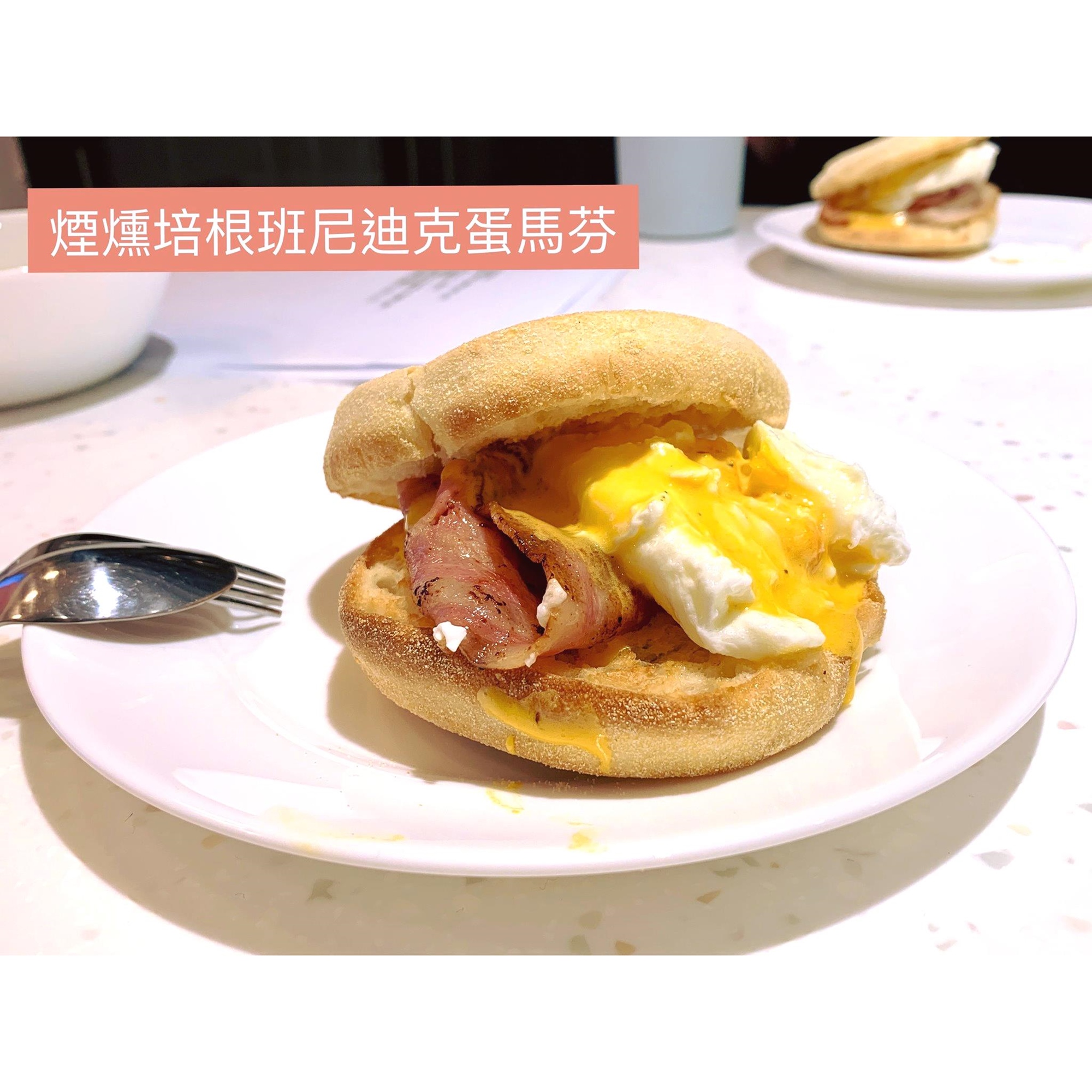 2.培根班尼迪克蛋:蛋、檸檬、煙燻鮭魚、奶油、馬芬