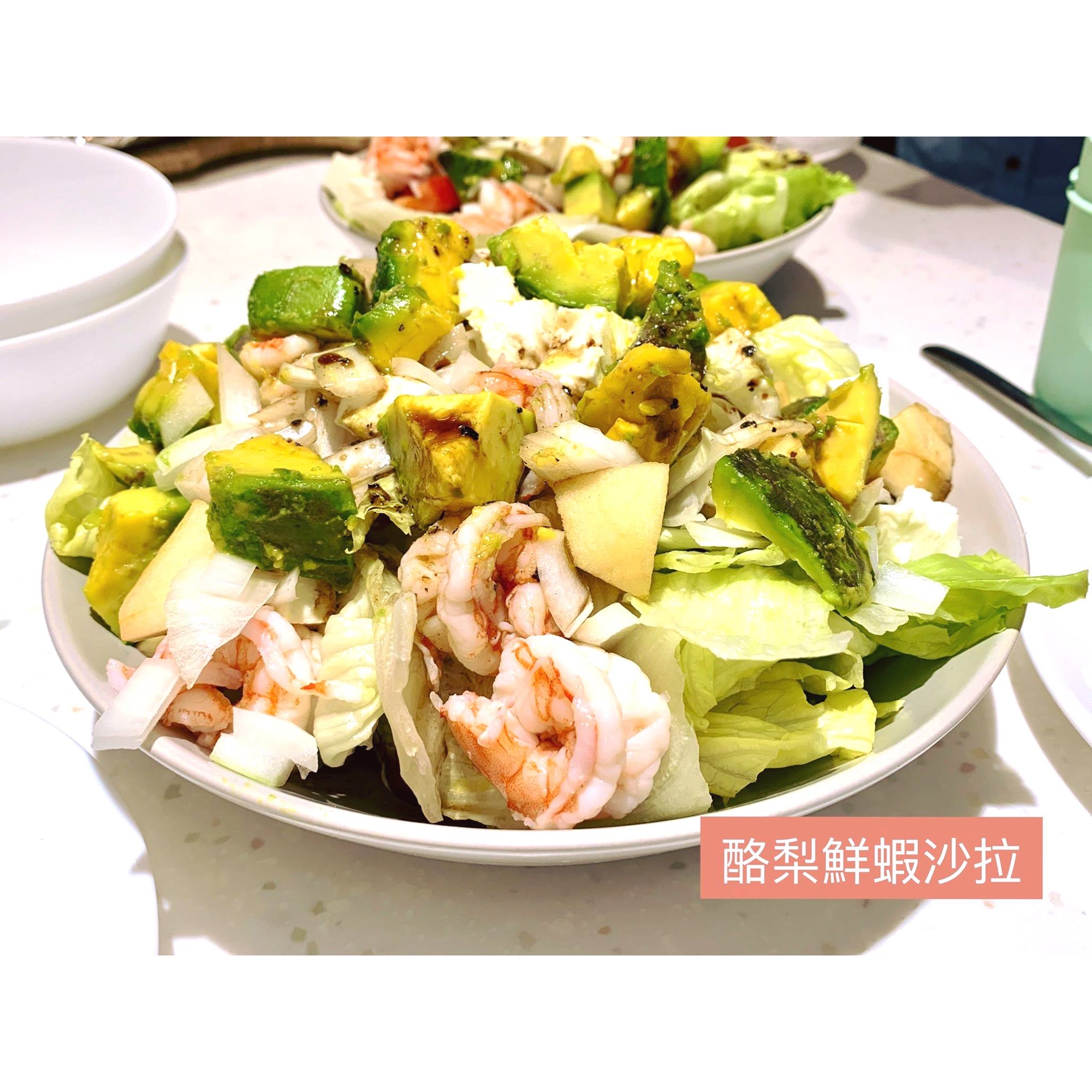 1.酪梨鮮蝦沙拉:蝦、酪梨、番茄、蘋果、生菜