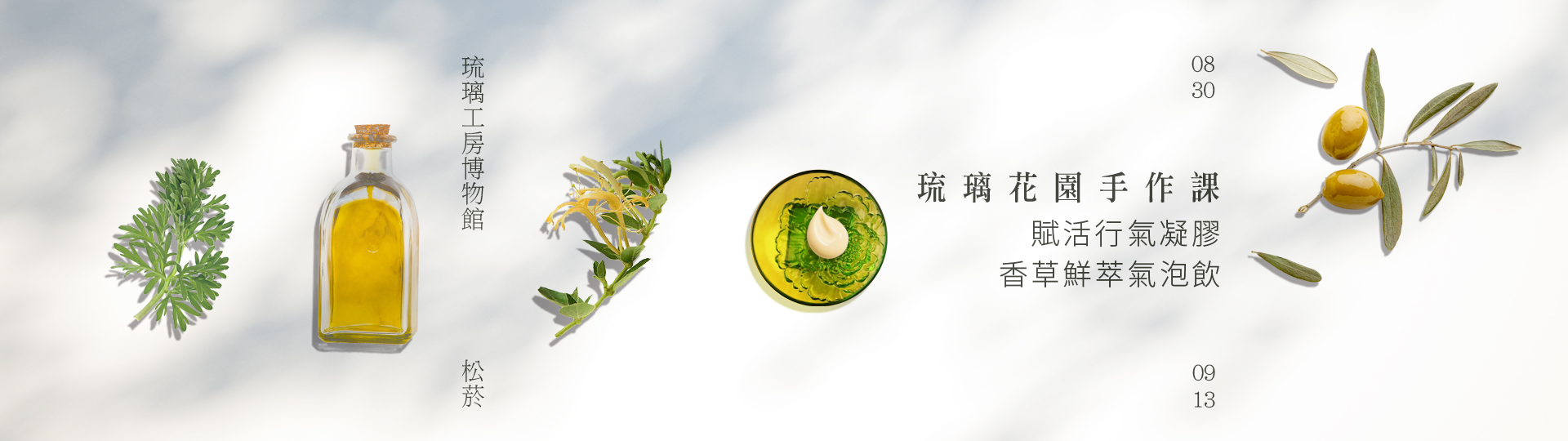 炎炎夏日,是否被熱得懶洋洋地呢?邀請您來參加松菸 ‧ 琉璃工房博物館本季限定推出的手作課,一起動手做成分有機天然,連小朋友都可安心使用的按摩凝膠,另外還有要你發揮創意特調的香草鮮萃氣泡飲,共計約兩個小時,課程結束後每位學員都可以獲得一支30ml的「草藥賦活行氣凝膠」以及一瓶500ml的「香草鮮萃氣泡飲」。