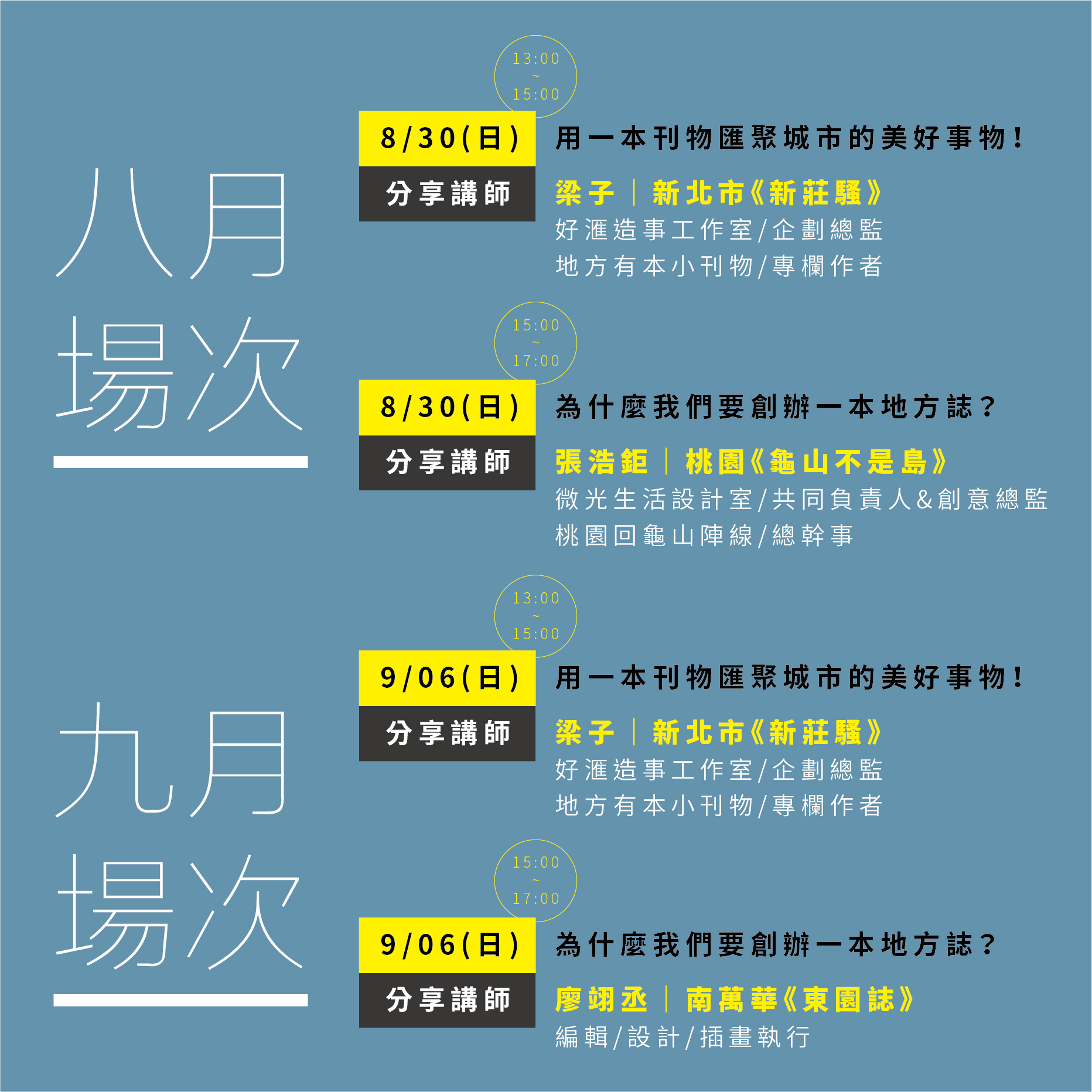本次邀請三位團隊代表擔任分享講師:新北市《新莊騷》、桃園《龜山不是島》,以及南萬華《東園誌》。