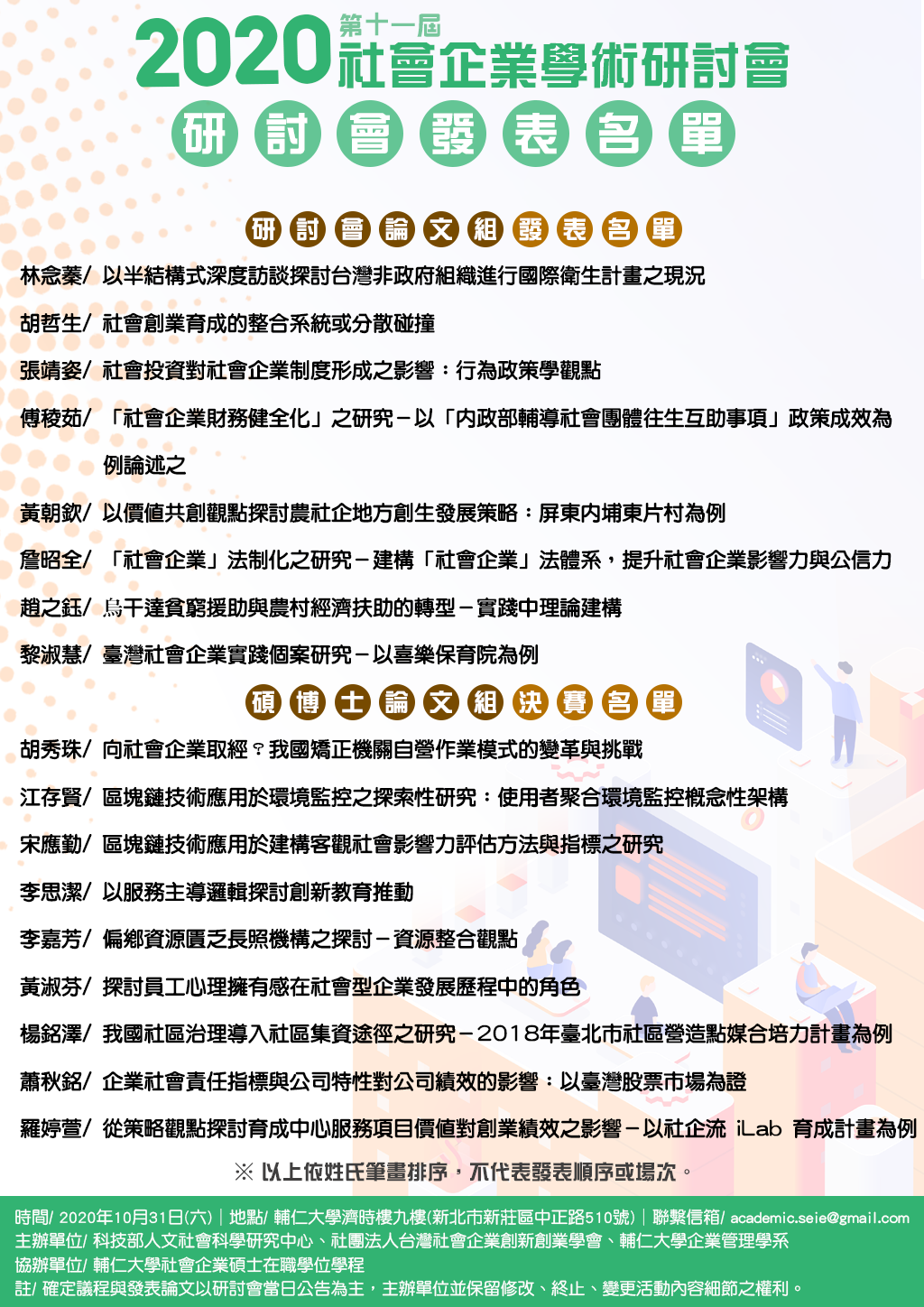 每年一次的社會企業學術研討會,對外開放報名囉!我們提供一種無形的服務,廣邀各界人士齊聚一堂,分享自己多年的研究成果,也一同探討台灣社會企業的發展走向,在這裡講者能夠宣導自身的想法並被肯定,聽眾能夠取得一些新思維與講者對話,互相碰撞與激發出新觀念,使論文研究或學術貢獻更能大大邁進與提升。