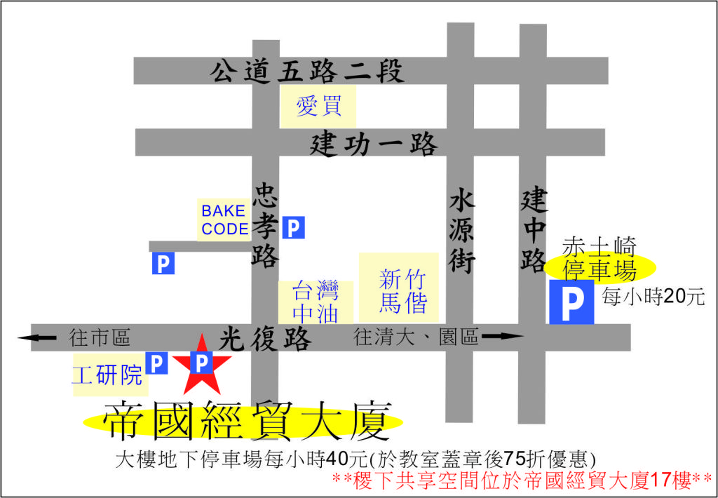 B.走中山高速公路,於新竹交流道下,直行光復路,即抵達帝國經貿大廈17樓之1 (稷下共享空間)。