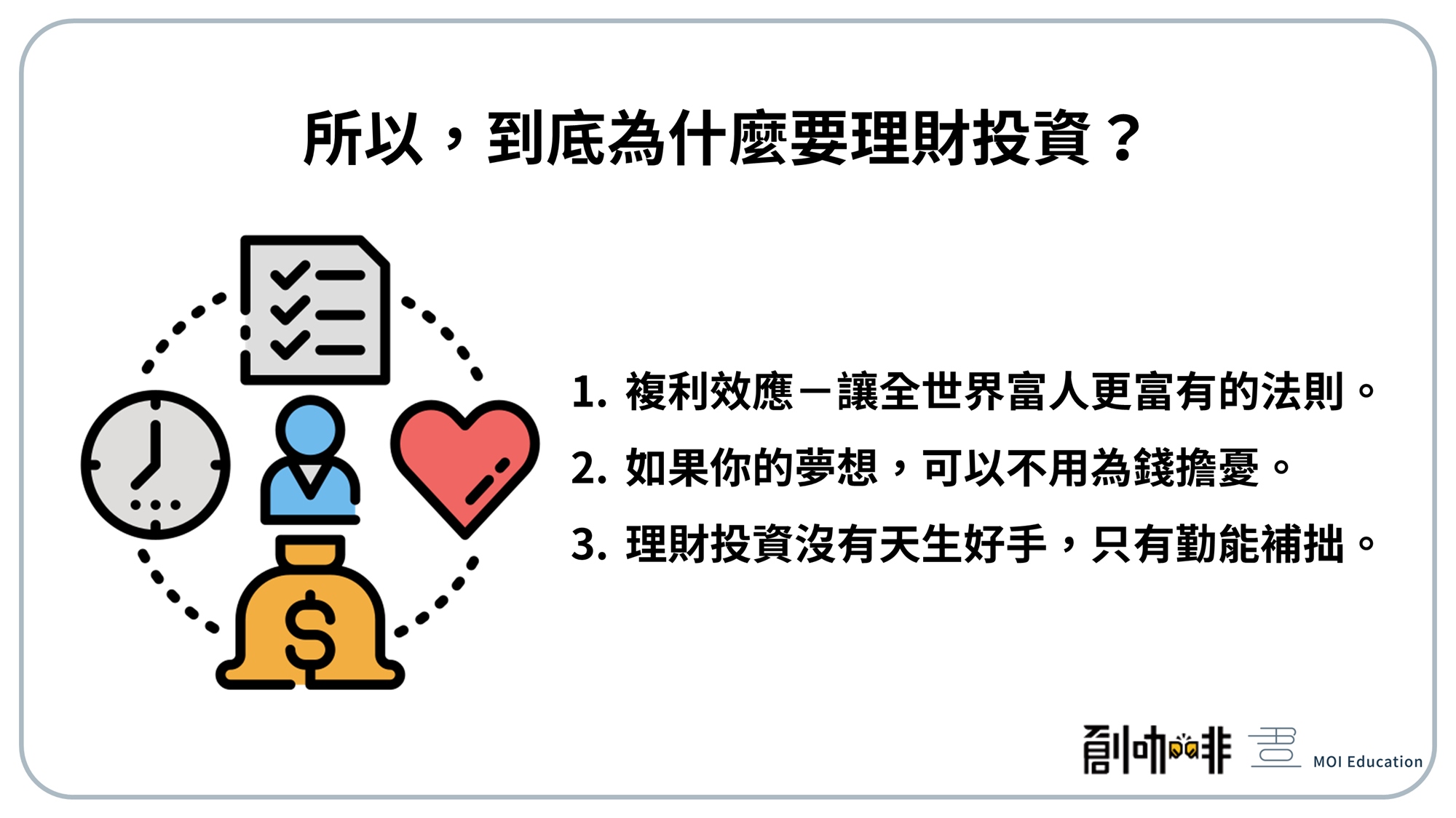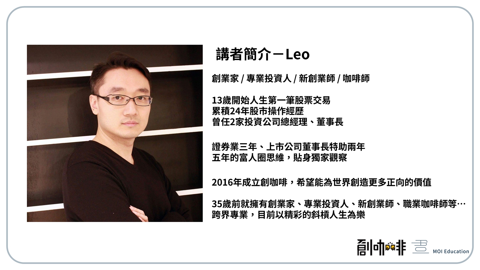 現在的經濟環境,更需要我們仔細衡量,在危機中尋找轉機。在通貨膨脹大於經濟成長,在銀行利率低於物價上漲,在世界經濟變化比以往任何時刻都更難預期的現在,這一群追尋穩定工作、擁有小資收入的年輕族群,將需要能夠協助他們將理財納入生活,為自己投資與創造獲益的方法,MOI Education 與 創咖啡團隊 融合教育設計、課程發展、社群經營與金融專業,聯手打造能協助小資族群聰明理財的Money How 財之道微社群,帶你依照最適合自己的方式,規畫屬於你的財富之道。