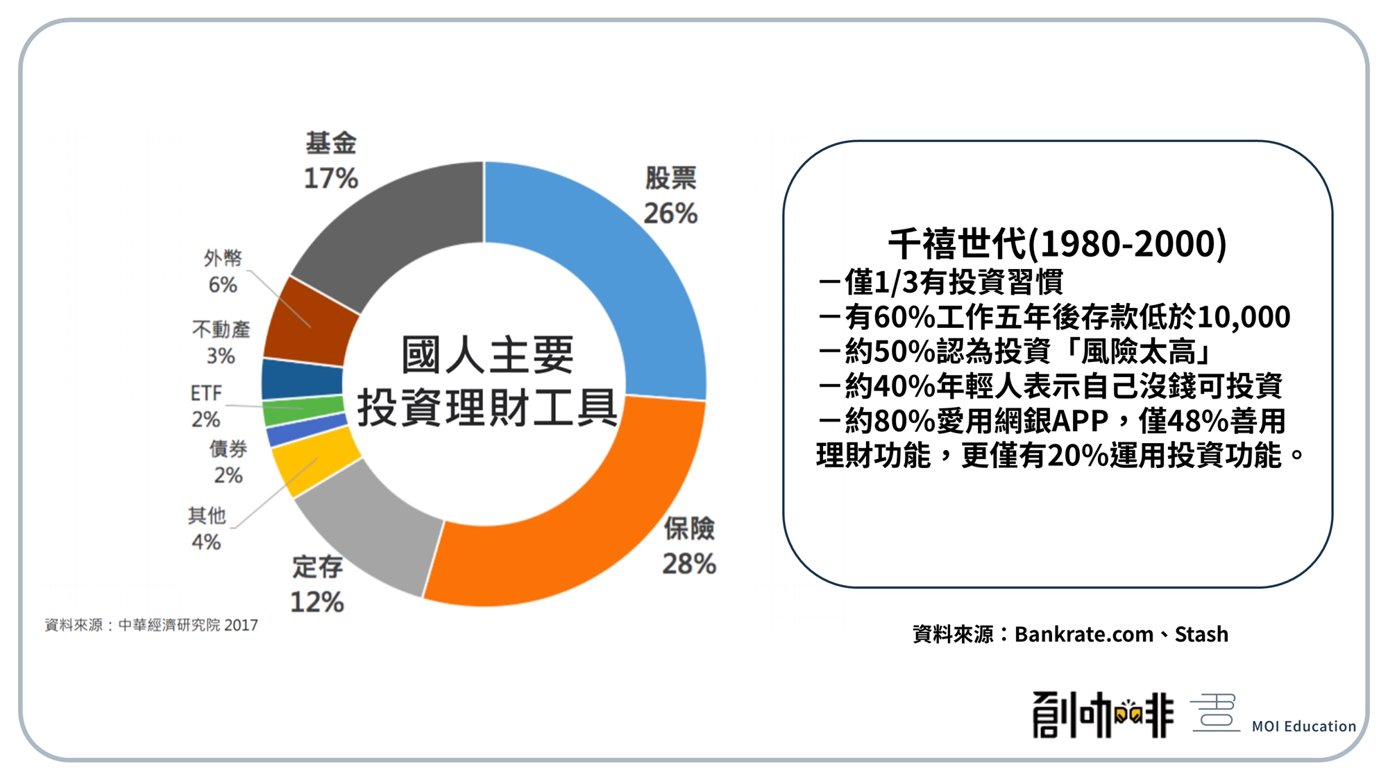 根據 2017 年中華經濟研究院調查發現,有投資行為的國人在選擇理財投資工具時,有超過 63% 投資人都在相對低風險的投資環境中浮沉。更進一步的研究發現,超過半數的投資人並未依照自己適合的投資屬性與風險承擔程度進行投資選擇,導致許多不必要的損失。除此之外,根據數位民調Bankrate與Stash調查指出,千禧世代(1980-2000出生者)僅1/3表達自己有投資習慣,更有60%的年輕人在第一份全職工作五年後存款仍低於10,000元。