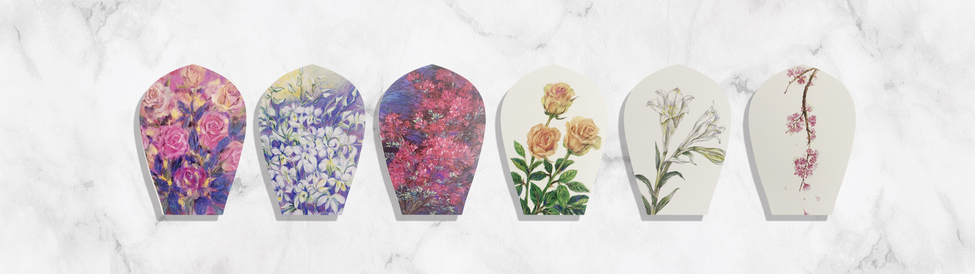 《散華》於古時壇場是一種獻花儀式,流傳已有一千多年歷史。琉璃工房以創意,結合當代繪畫,特邀氣質畫家洪幸芳老師繪製《散華》花卡,一套六款(市價150元),合而為一即成一枚六瓣蓮花。