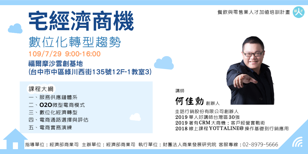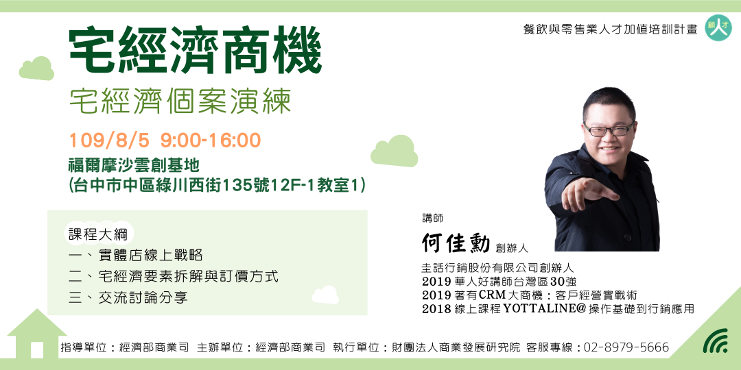 電商平台攻略班Part Ⅲ- 宅經濟個案演練 | 8/5 9:00-16:00 | 一、實體店線上戰略 二、宅經濟要素拆解與訂價方式 三、交流討論分享 |