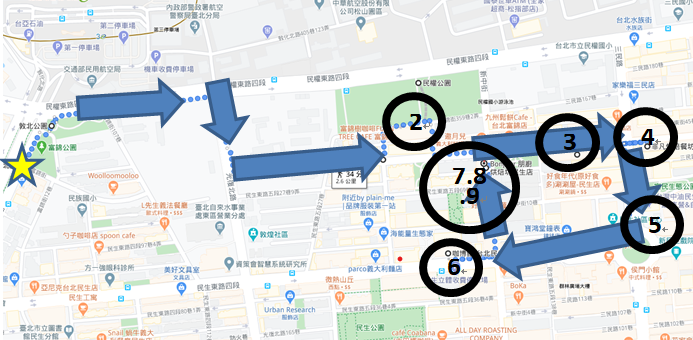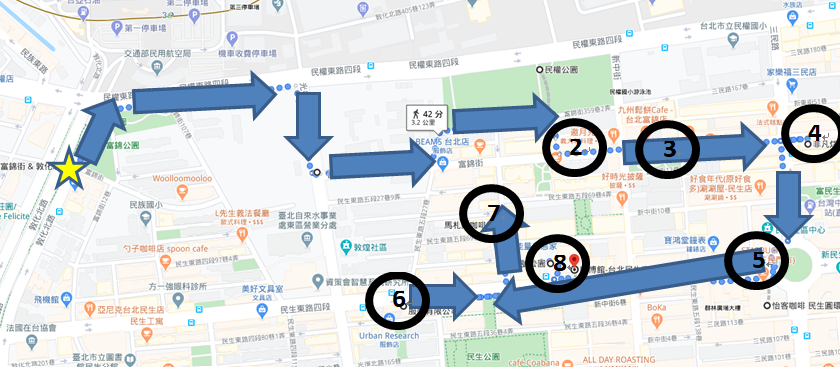 1.★集合點富錦街、敦化北路口→2.非苣不可→3.民生公園→4. 好時光披薩→5.Bonjour 朋廚烘焙坊→6.花也→7.富錦三號公園→8.手作體驗-咖博館