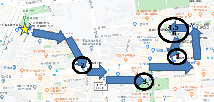 1.★集合點富錦街、敦化北路口→2.富錦街→3.鬧聚HUBBUB→4.非凡烘焙餐坊富錦街→5.古典美服飾→6. 馬扎羅咖啡烘焙→7.手作體驗-咖博館