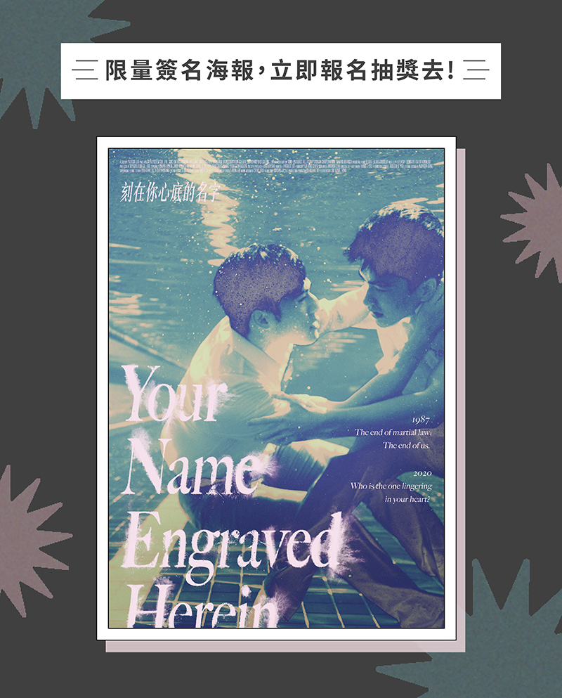 史詩青春愛情電影《刻在你心底的名字》,由《花甲》系列導演瞿友寧編劇、監製,導演柳廣輝執導,國際版海報視覺,找來知名設計師方序中操刀設計。海報設計師方序中與監製瞿友寧、導演柳廣輝歷經一番討論、達成共識後,決定把身穿制服的兩位男主角拉回到泳池拍攝,重現他們第一次遇見彼此的畫面,制服也象徵著在80年代他們成長過程的狀態,並投入對於那個年代的感受和一些自我想像,海報色調融合溫暖的粉色和舒適的藍色,是對那時代更有想像的一種表現方式,而兩位男主的關係透過在水中的互動,到底是想要彼此靠近擁抱,還是要互相的拉扯,讓大家有更多的想像空間。