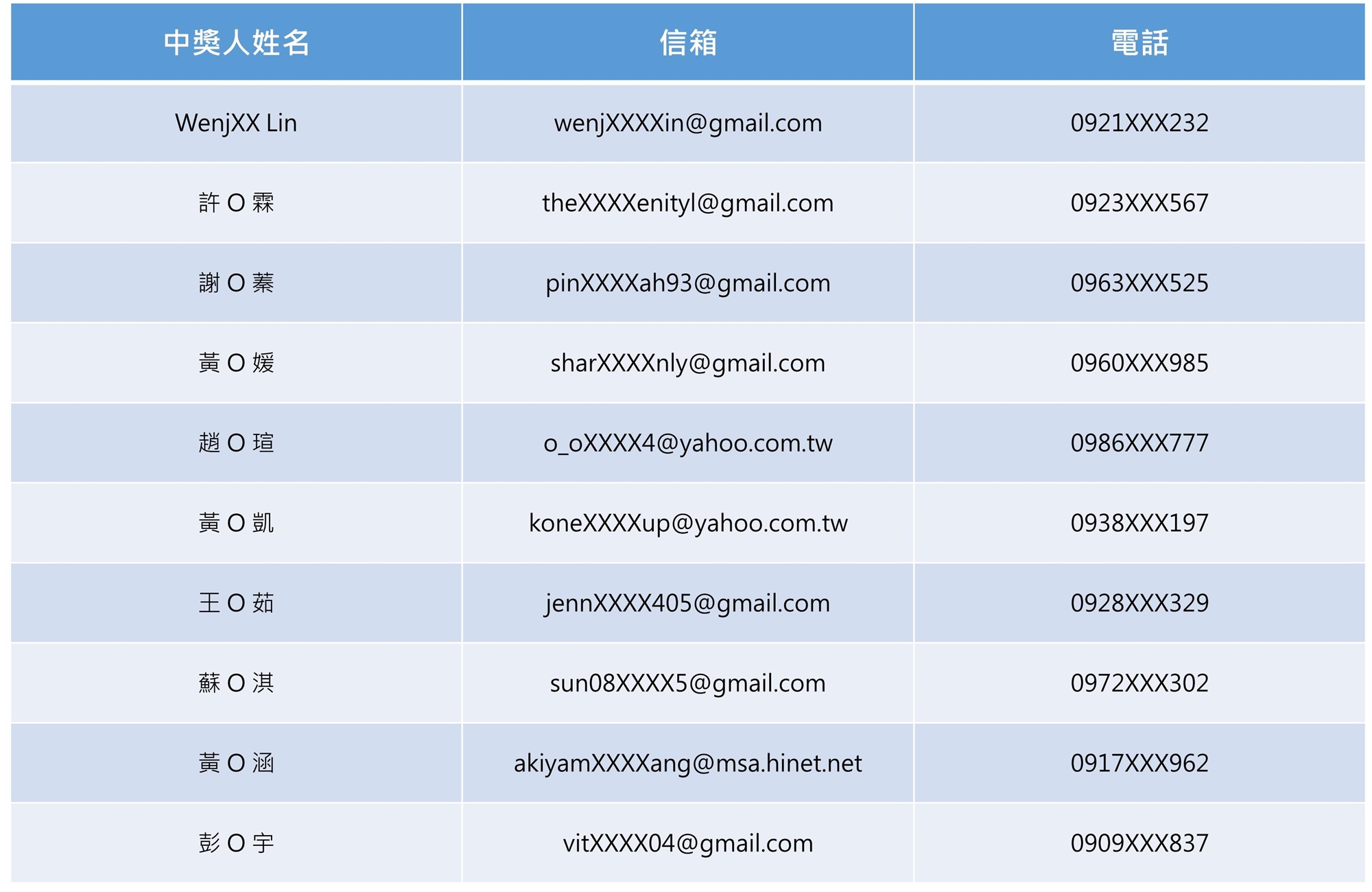2.本次活動中獎通知信將會透過信箱寄發,若中獎者未提供資料或提供不實資料,導致無法通知中獎而影響領獎時程,將須自行負責,本活動不會再進行候補中獎者抽選。