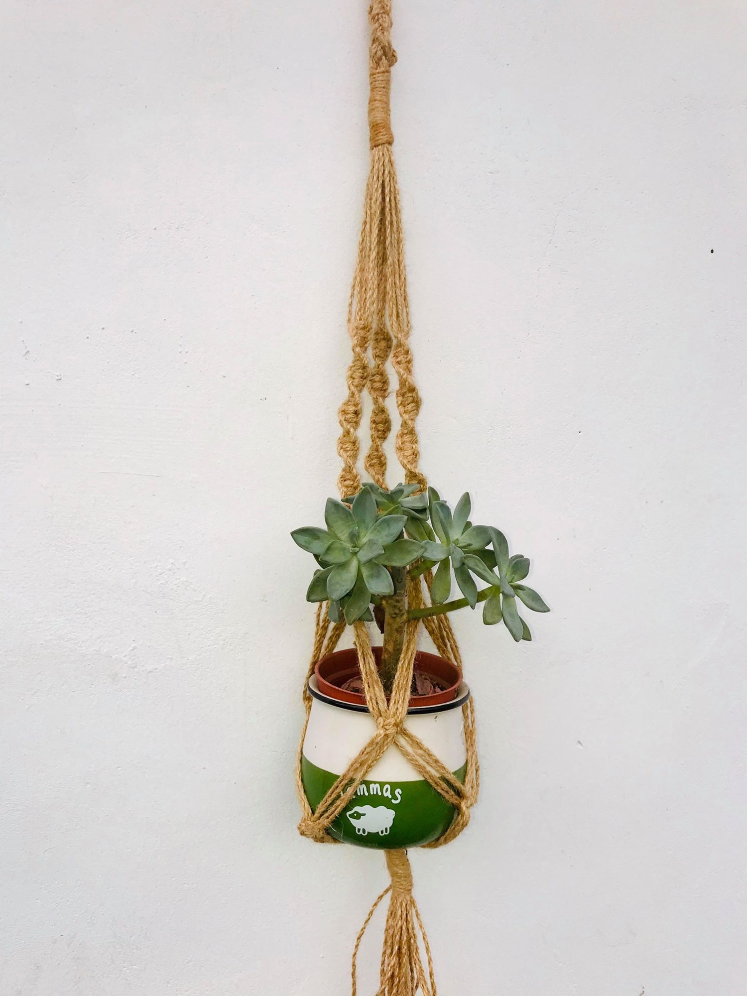 植物吊籃編織:使用麻繩以簡單的平結,變化不同的打結方法,編織成植物吊籃,讓平常的植物盆栽搖身一變成具有北歐家居風格的植物吊籃,瞬間改變空間美感。