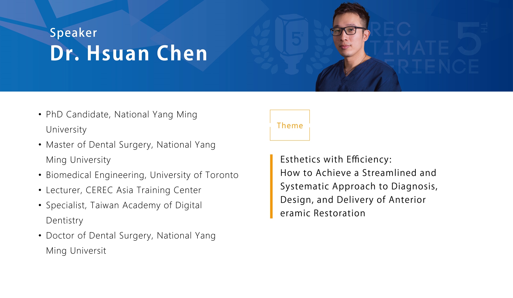 The difficulty in esthetic dental restoration in the anterior region lies in its unpredicability. But people are not as unique or subjective as we think. In this lecture, Dr. Hsuan Chen will illustrate how he streamlines the entire treatment process, from diagnosis, to design, to delivery, with a systematic approach. He will talk about how to meaningfully convert a patients cosmetic need into clinically-relevant references for ceramic selection and smile design. Other important topics that this lecture will touch upon are the significance of color precision and the tools necessary to communicate with the dental lab efficiently. By removing variability with a guided approach, esthetic restoration can be achieved with high consistency.