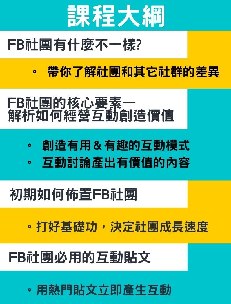 本次課程,邀請到擁有12年電商經驗,操作超過20種不同題材社團的資深社群內容經營者梁廷榜老師,前來分享最新的Facebook社團經營資訊與方法,並手把手傳授操作實務,帶你突破社群經營的瓶頸,重新找回高觸及!