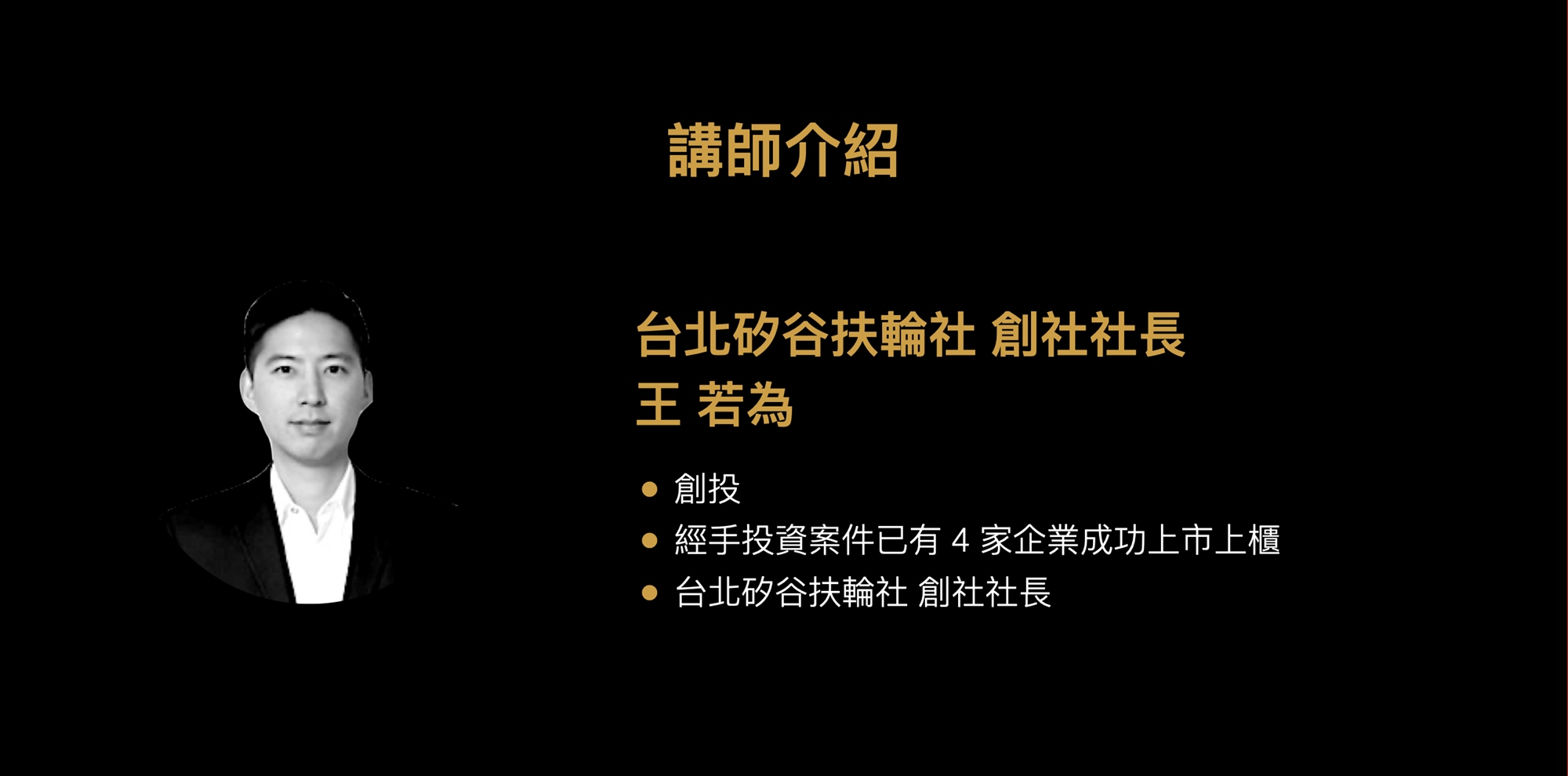 講師 王若為 Alan 是一位創投,至今經手的投資案已有 4 家企業成功上市上櫃,本次講座將用以下三個主題來讓大家了解,在被投資機率僅有 2~3% 的創投生態裡,如何提高自己成功募資的勝率 😍😍😍 :