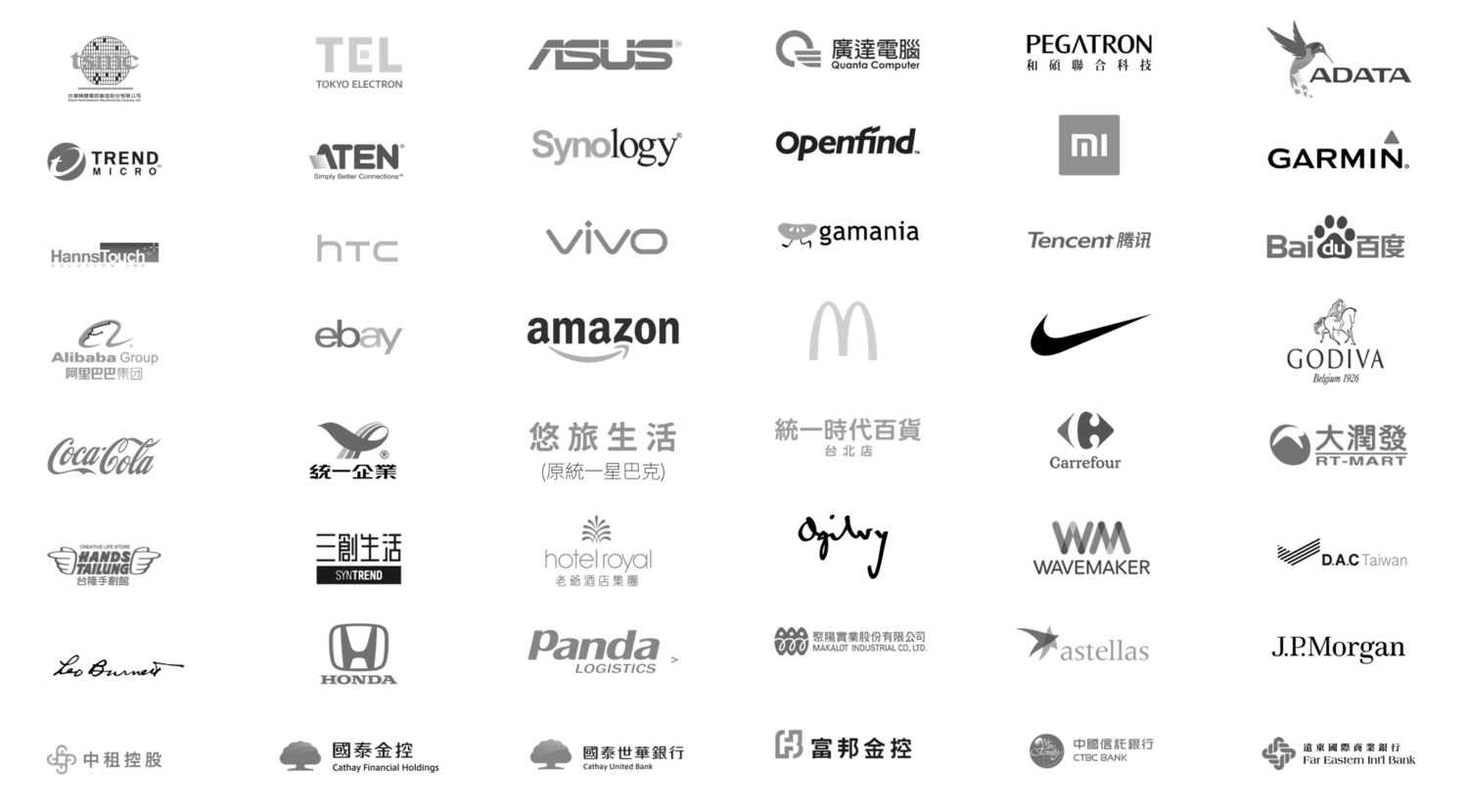 Apple、小米、台積電、正崴精密、國泰金控、富邦金控、群益證券、勤業眾信、麥當勞、家樂福、遊戲橘子、遠通電收、資策會、工研院、行政院人力發展學院、新竹科學園區等。