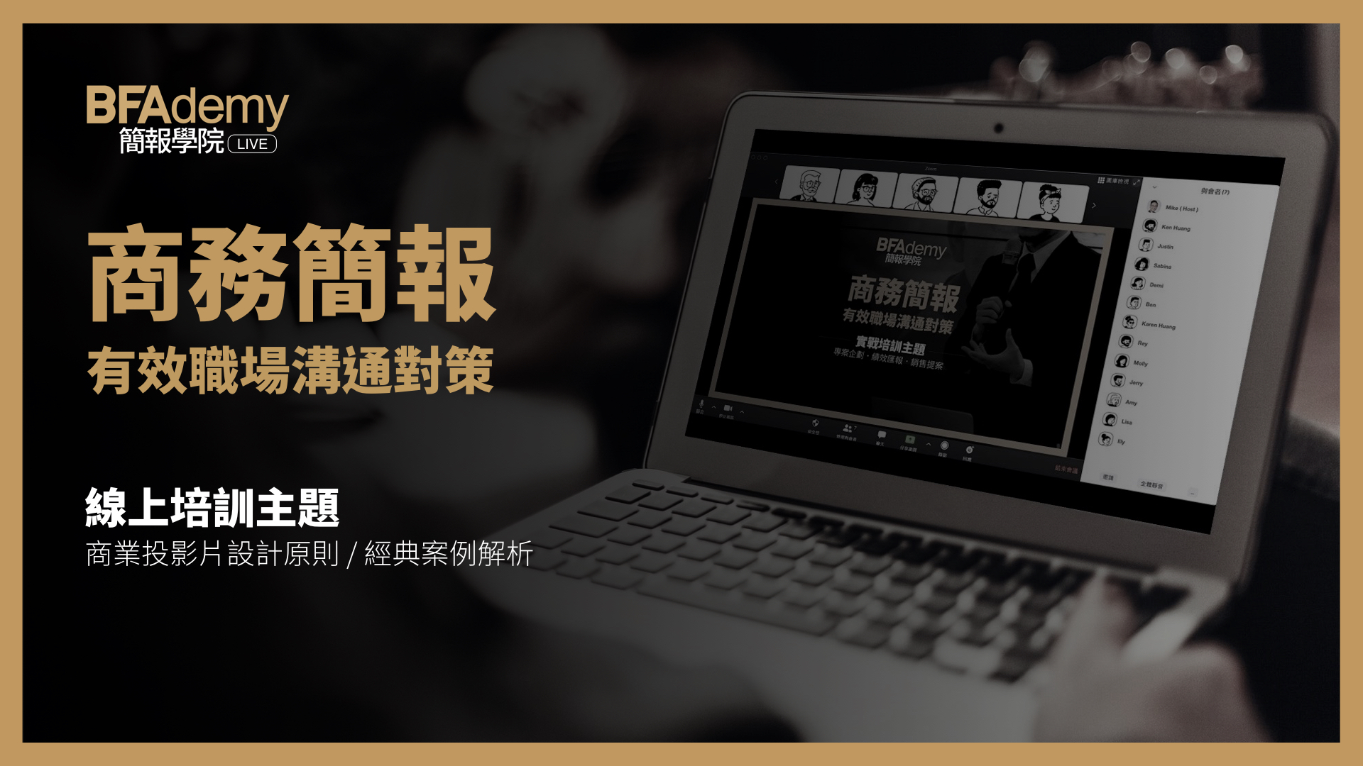 BFAdemy LIVE 簡報學院是為商務人士量身打造的線上學習方案,專注於商業投影片的設計觀念,拆解職場實際的投影片案例,提供實用的方法與工具,協助學員打磨兼具重點與質感,同時符合企業規範的投影片。