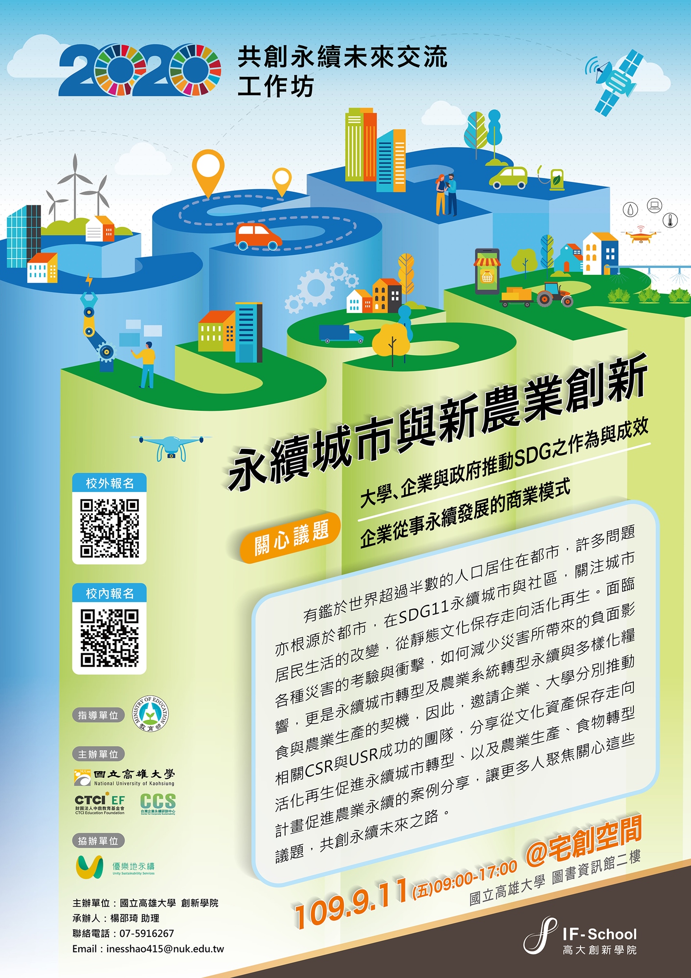 今(2020)年本工作坊特將論壇主題訂為「永續城市與新農業創新」,有鑑於世界超過半數的人口居住在都市,許多問題亦根源於都市。此外,面臨極端氣候、乾旱、洪水等各種災害的考驗與衝擊,更是永續城市轉型及農業系統轉型與多樣化糧食與農業生產的契機,因此,邀請企業、大學分別推動相關CSR與USR成功的團隊,分享永續城市轉型、以及農業生產、食物轉型計畫促進農業永續的案例分享,讓更多人聚焦關心這些議題,具體看見永續未來的樣貌,並藉由桌遊互動的實務操作,讓與會者了解環境、社會與經濟(公司治理)專家之間,在面對組織運作與外部風險,如何從中找尋消除風險與危機的可行方案,共創永續未來之路。