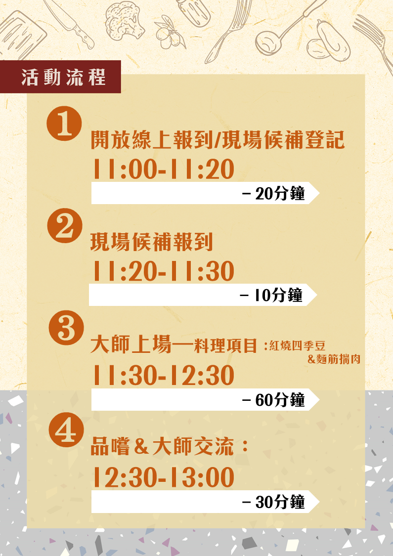 - 活動當天報到時間:11:00至11:30,若11:20仍未完成報到手續則將參加資格優先開放給現場候位民眾,網路報名者則自動轉為候補。
