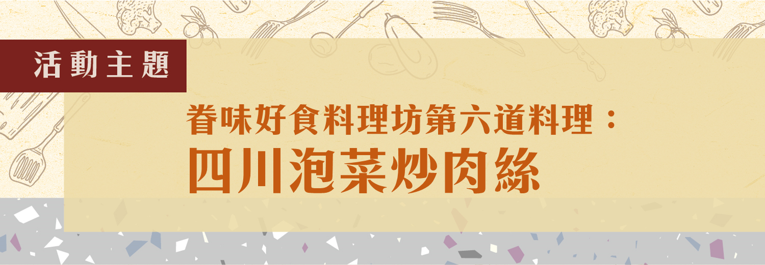 眷味好食料理坊第六道料理,邀請眷味好食男性講師-陳安達,以【四川泡菜炒肉絲】為主題,其實眷村的泡菜種類太多,但泡菜總是能出現在餐桌上,因為簡單好製作,家家都有一缸醃製的食物,而將又酸又辣的四川泡菜拿來炒肉絲,絕對是非常鮮豔可口,且也是一道非常經典的眷村料理。