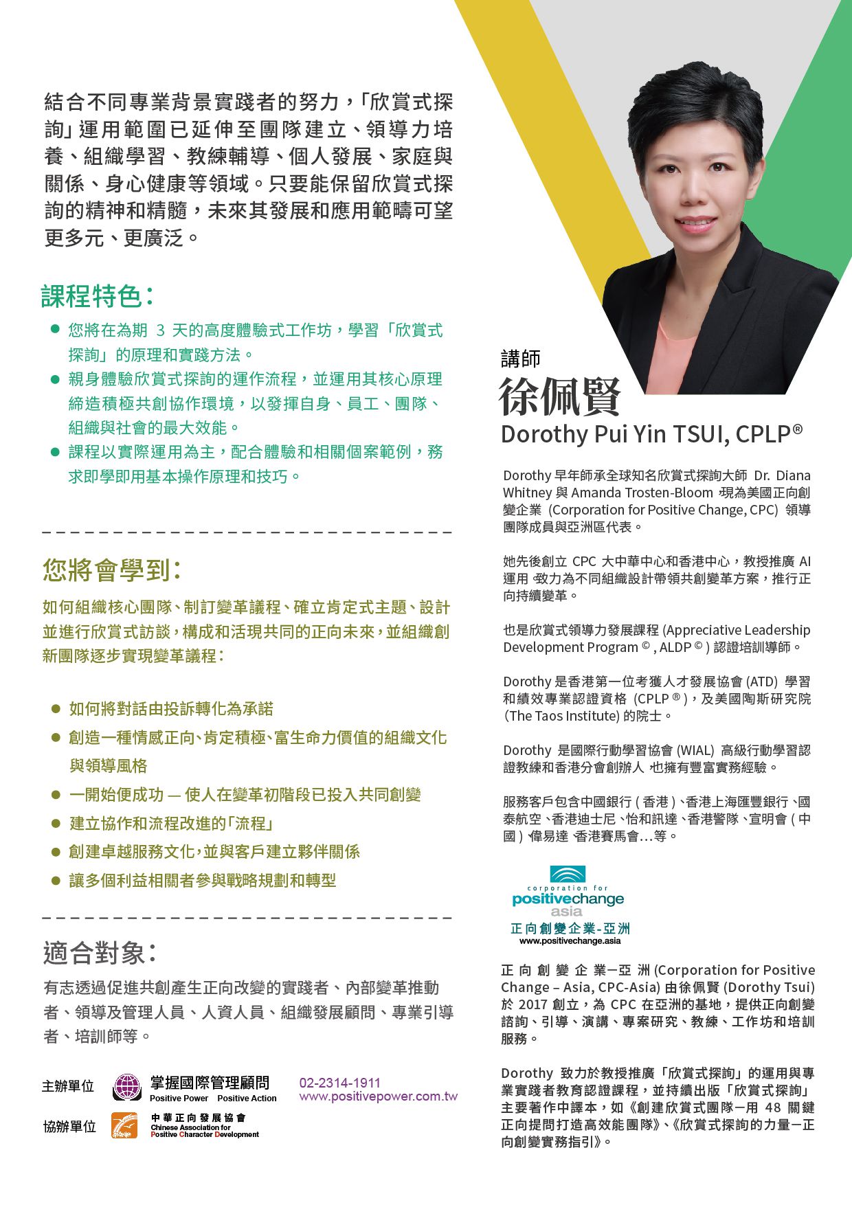 - 正向創變企業-亞洲 (Corporation for Positive Change – Asia, CPC-Asia) 由徐佩賢 (Dorothy Tsui) 於2017創立,為CPC在亞洲的基地,提供正向創變諮詢、引導、演講、專案研究、教練、工作坊和培訓服務。Dorothy致力於區內教授和推廣「欣賞式探詢」的運用,教授專業實踐者教育認證課程外和出版「欣賞式探詢」主要著作的中文譯本,如《創建欣賞式團隊-用48個關鍵正向提問打造高效能團隊》《欣賞式探詢的力量—正向創變實務指引》。