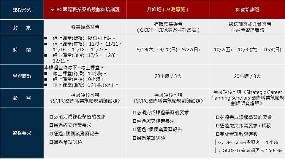 世界職業生涯規劃之父Dr. Thomas Clawson因應VUCA時代新的需求,組織全球專家創新開發了《SCPC國際職業策略規劃師》認證體系和國際證照。擁有新一代職業生涯規劃權威國際證照《SCPC國際職業策略規劃師》將助力企業HR、學校職業生涯輔導人員和生涯規劃從業人員更有方向及方法地因應VUCA時代新的變化幫助個體和企業實現個人生涯發展和企業人力資本發展的個性化解決方案。