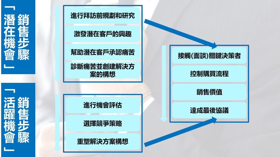 「潛在機會」銷售步驟: 進行拜訪前規劃和研究→激發潛在客戶的興趣→幫助潛在客戶承認痛苦→診斷痛苦並創建解決方案的構想→接觸(面談)關鍵決策者→控制購買流程→銷售價值→達成最後協議。 「活躍機會」銷售步驟: 進行機會評估→選擇競爭策略→重塑解決方案構想→接觸(面談)關鍵決策者→控制購買流程→銷售價值→達成最後協議。 |