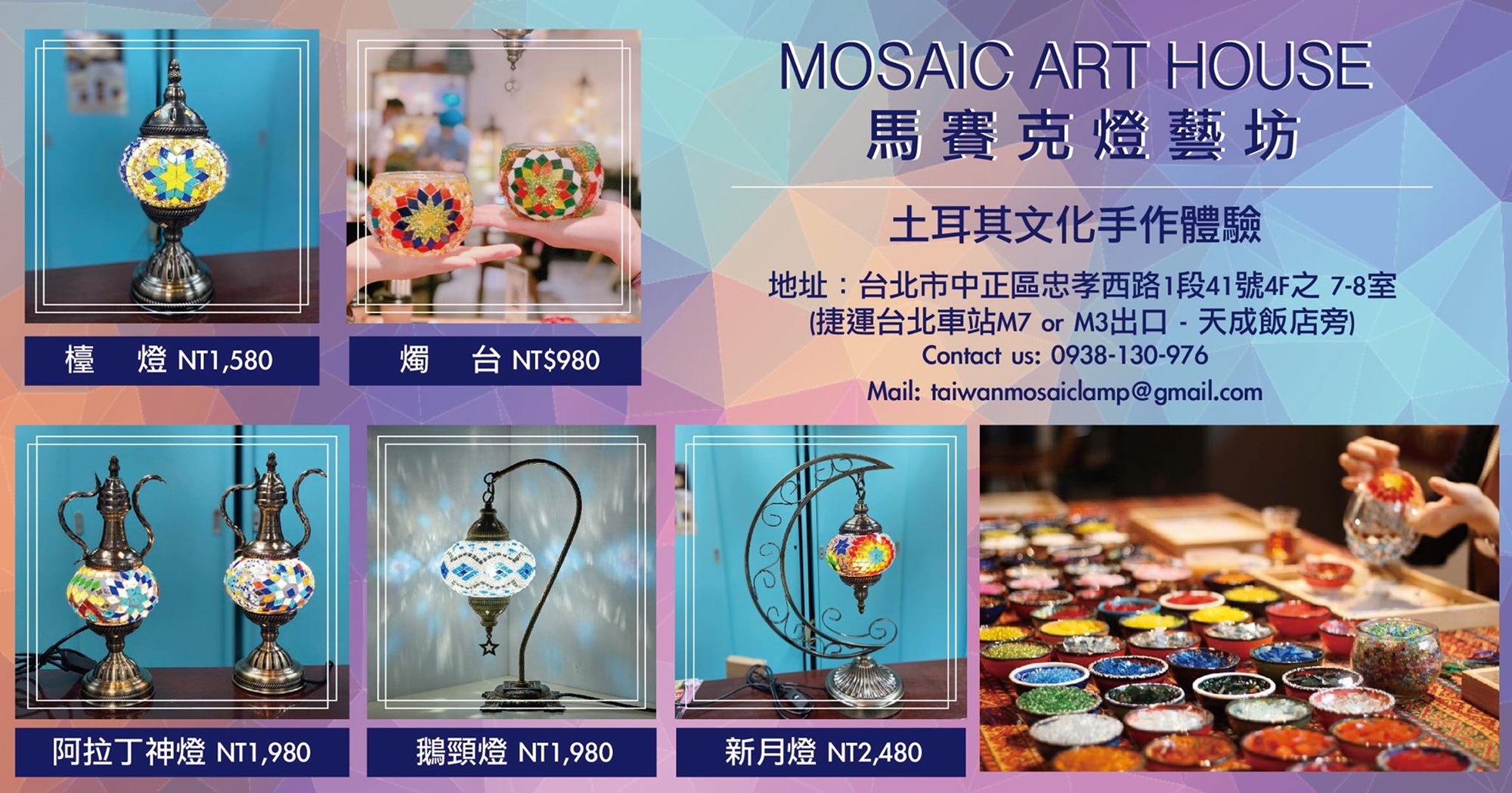 輕鬆體驗異國文化,能與家人、朋友、情人一同製作的傳統土耳其燈,增添您家中溫馨又溫暖的感受。初學者也能輕鬆上手,利用數種繽紛絢麗的手工切割玻璃馬賽克磚與彩珠,製作出漂亮精緻的土耳其馬賽克燈,每一盞燈都有屬於自己的故事,送禮自用兩相宜。您可以通過12種的手工切割玻璃和珠子製作的作品(土耳其傳統手工燈)照亮您的夜晚。快來體驗,讓您親手製作的土耳其馬賽克燈照亮溫暖您家中每一個夜晚吧