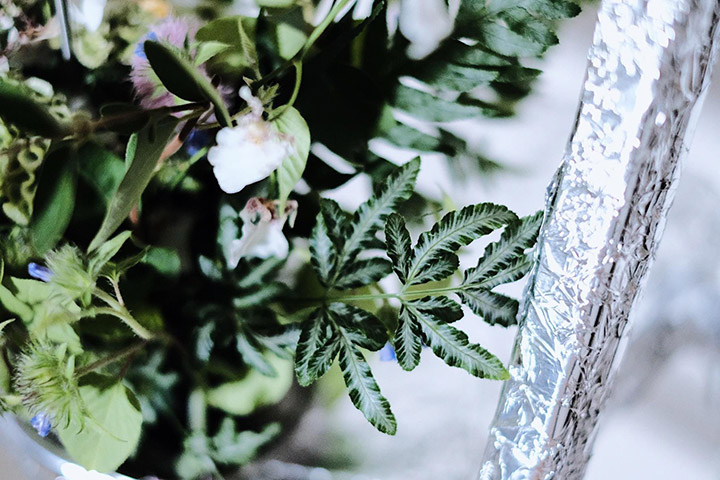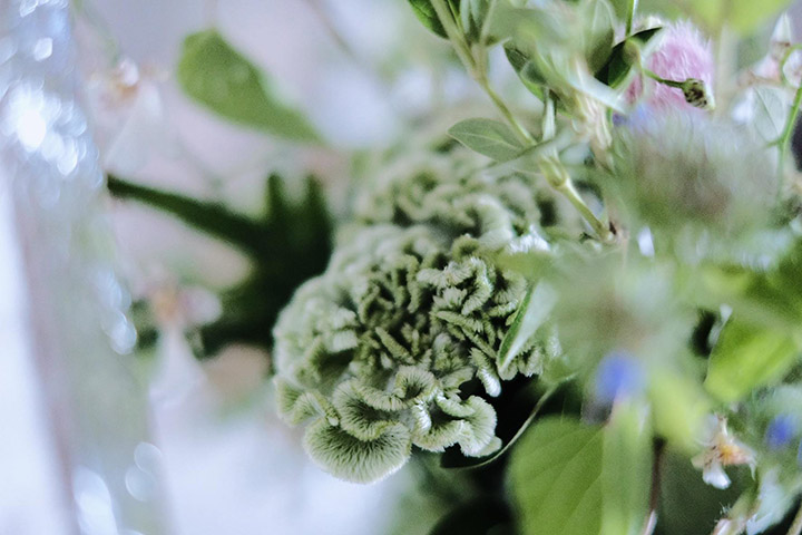 季節性花卉、香草與蕨類固定於訂製的器皿之中,