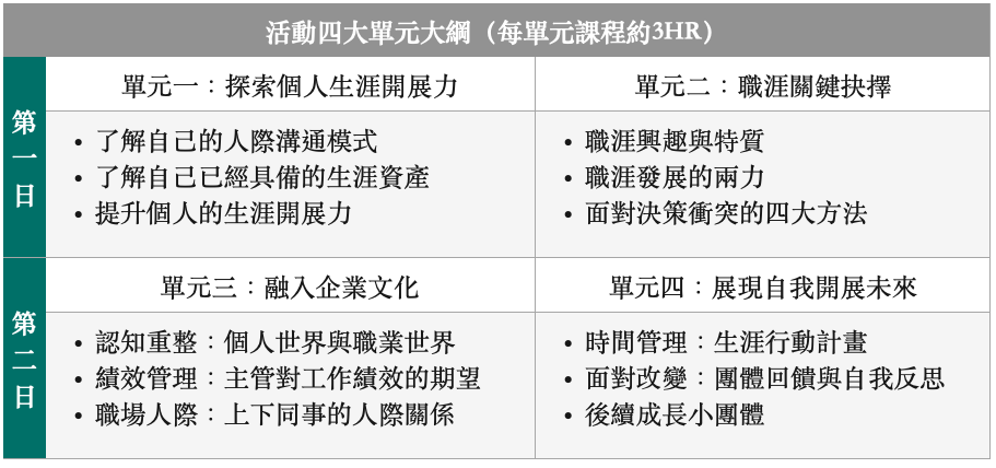 - 團體帶領老師:陳若玲 (臺灣女性生涯發展協會理事長,國際化公司人力資源副總裁,東吳大學生涯發展中心創辦人)