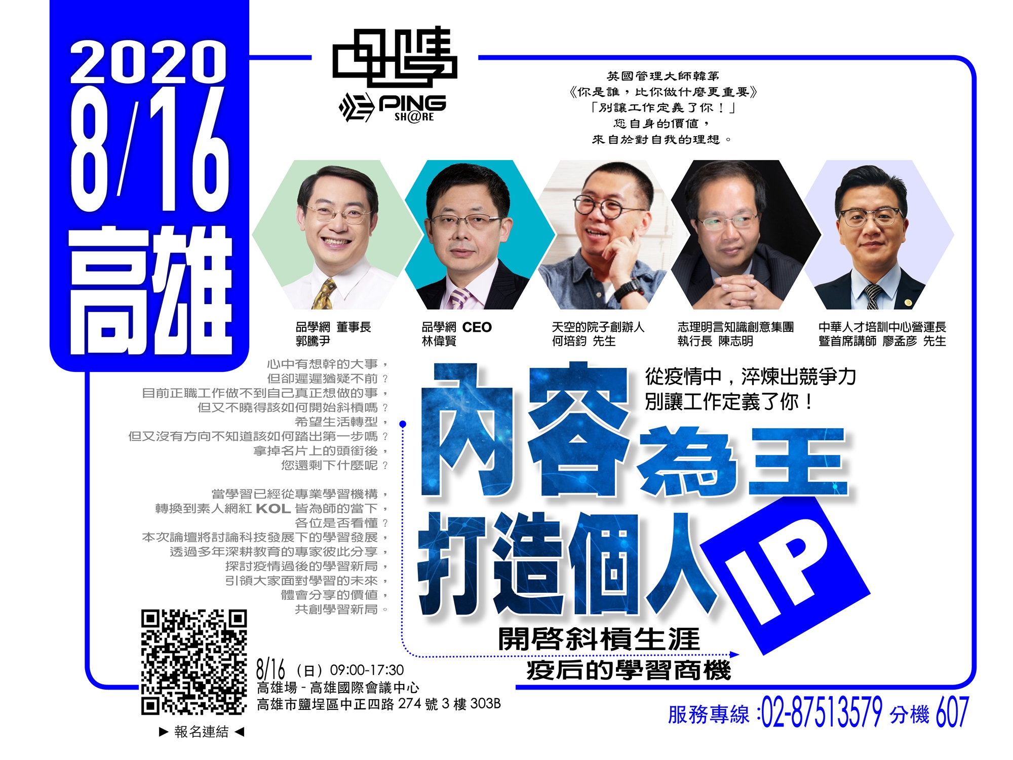 核心課程包含講師培訓、高效簡報技巧、主管管理職能、高績效團隊建立、顧客滿意與抱怨處理、顧問式銷售技巧、雙贏談判技巧、高效溝通技巧...等。授課企業更包含台積電、友達光電、日月光、BenQ、聯發科、富邦金控、國泰金控、中信金控、信義房屋、中華汽車、寶成工業、統一企業等。為品學網分享的疫後學習新局,你絕對要把握!