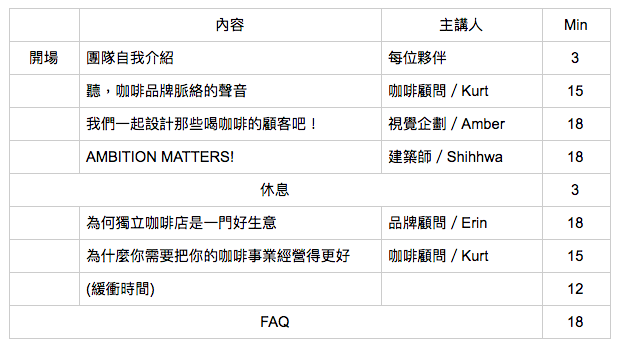 這一次,別失望,我們沒有要分享怎麼選咖啡豆、怎麼煮咖啡,而是在咖啡產業獨立品牌建立的路上,我們想要跟大家分享如何從起心動念出發,創造自己的市場差異以及獲利能力,其中包括原料、技術、設備、空間美學,平面視覺、體驗形象、傳播行銷策略、商業模式,都更值得跟您一起交流分享。