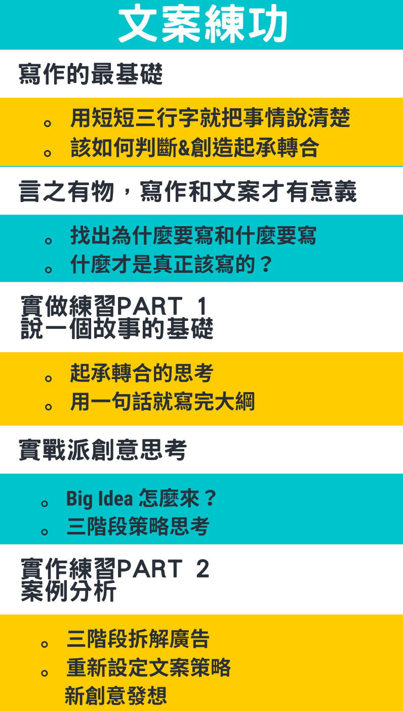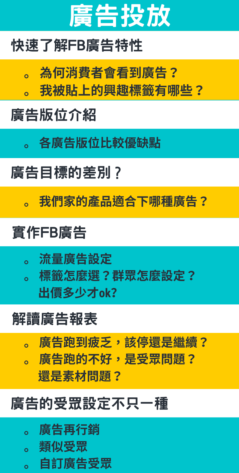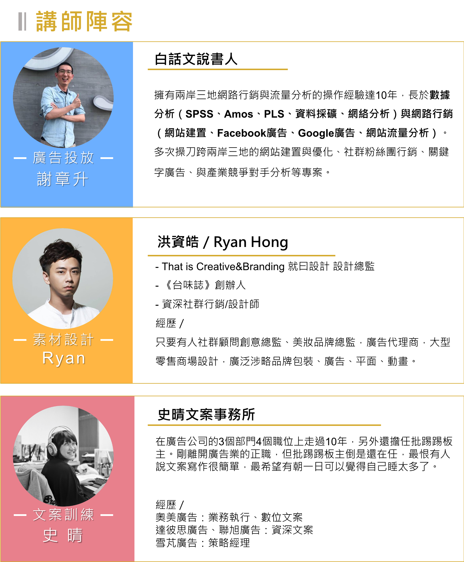 本次課程,邀請到活躍於兩岸三地網路圈的資深顧問謝章升、《台味誌》創辦人洪資皓(Ryan)以及資深廣告文案人史晴,透過24小時的課程,專注帶您直接以自家商品為標的,一步步掌握Facebook投放要領、銷售文案的撰寫心法、以及視覺素材的設計思維,您將可學會如何讓廣告效益精準放大,掌握高廣告投資報酬!