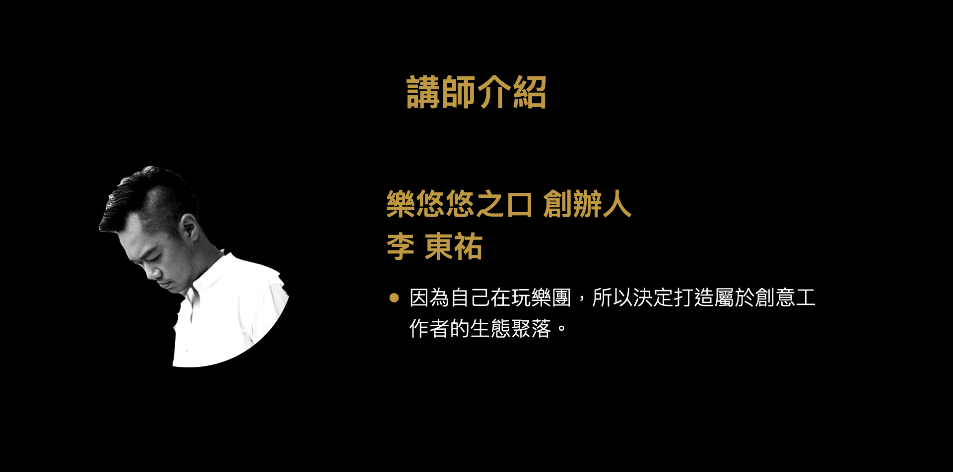 講師 李東祐是樂悠悠之口的創辦人,因為自己本身也在玩樂團,所以決定親自打造一個專門給創意工作者的生態聚落,聚落中從個人工作室、Live House到團隊行銷資源一應俱全,本次講座將用以下三個主題來讓大家了解,身為一個創意工作者,如何打造團隊 IP,擴大自己的影響力😍😍😍 :