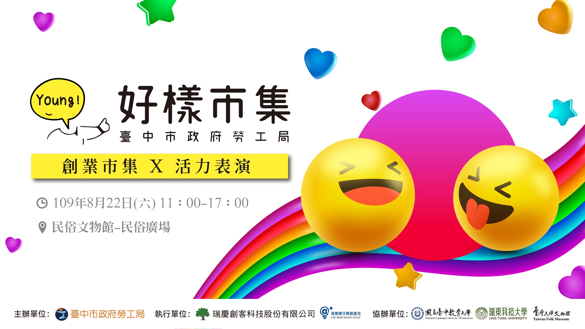 臺中市勞工局串聯本市各大專院校育成單位,培育具創業動機的青年,以市集作為起始站,實踐創業夢想。第6場次於8月22日(星期六)上午11時至17時在民俗文物館前廣場舉行,將青年創業家獨特的產品推廣給民眾,藉人潮自我檢視品牌市場接受度,透過現場與消費者的互動,傳遞理念與初衷,加深品牌知名度。