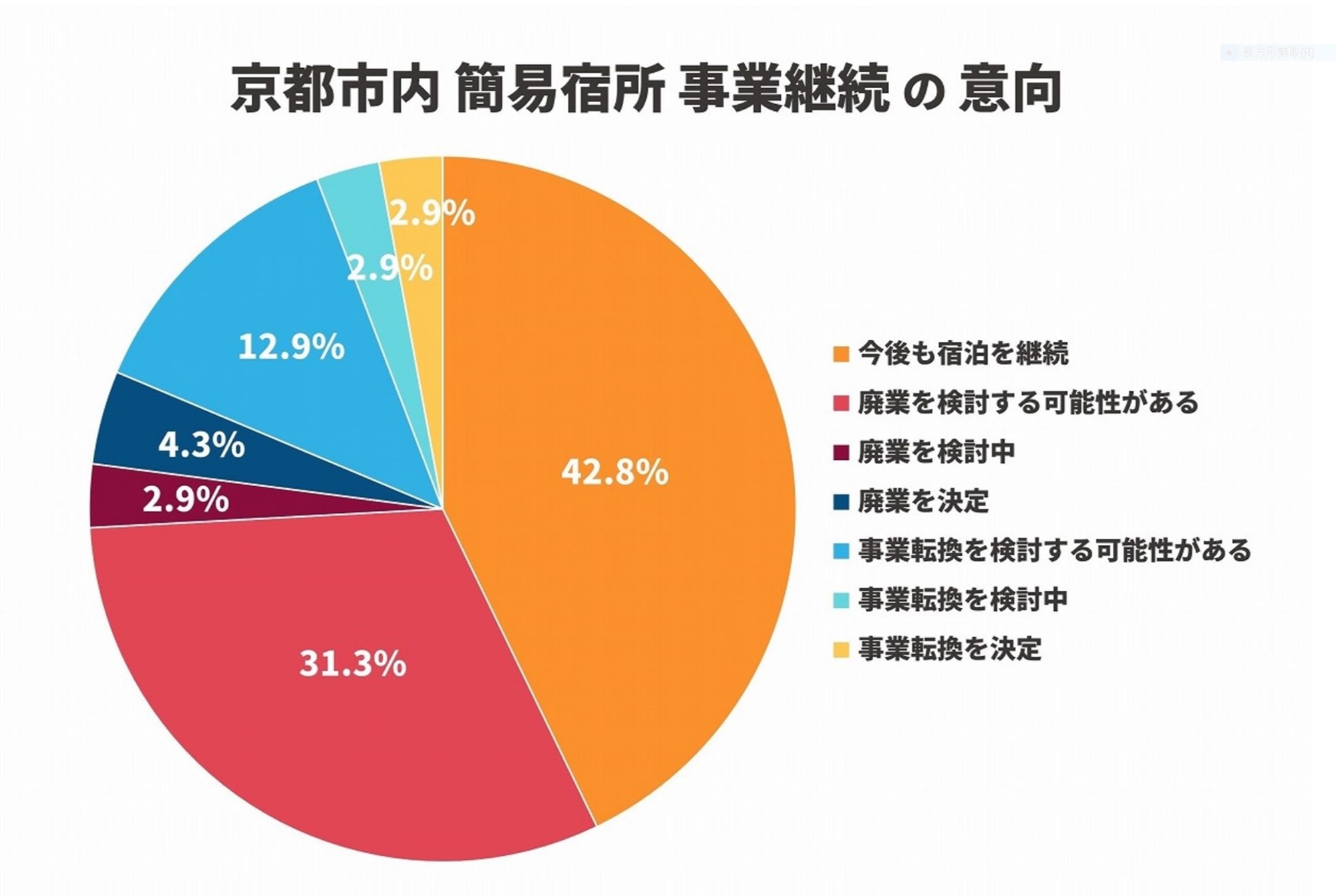 ▘根據京都外國語大學廣岡裕一教授(観光学研究室)的報告,有 4.3 %的簡易住所營業主已經決定廢業,34.2%的營業主正在考慮廢業,其他如事業轉換(12.9%)等...決定繼續營業的為 42.8%,低於全體一半;