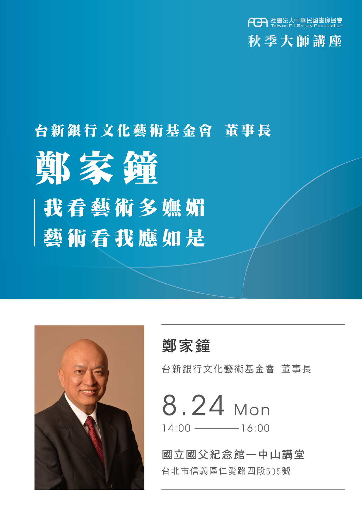 社團法人中華民國畫廊協會於2020年8月24日(一)舉行秋季大師講座,邀請台新銀行文化藝術基金會董事長:鄭家鐘先生,主講【我看藝術多嫵媚 • 藝術看我應如是】。