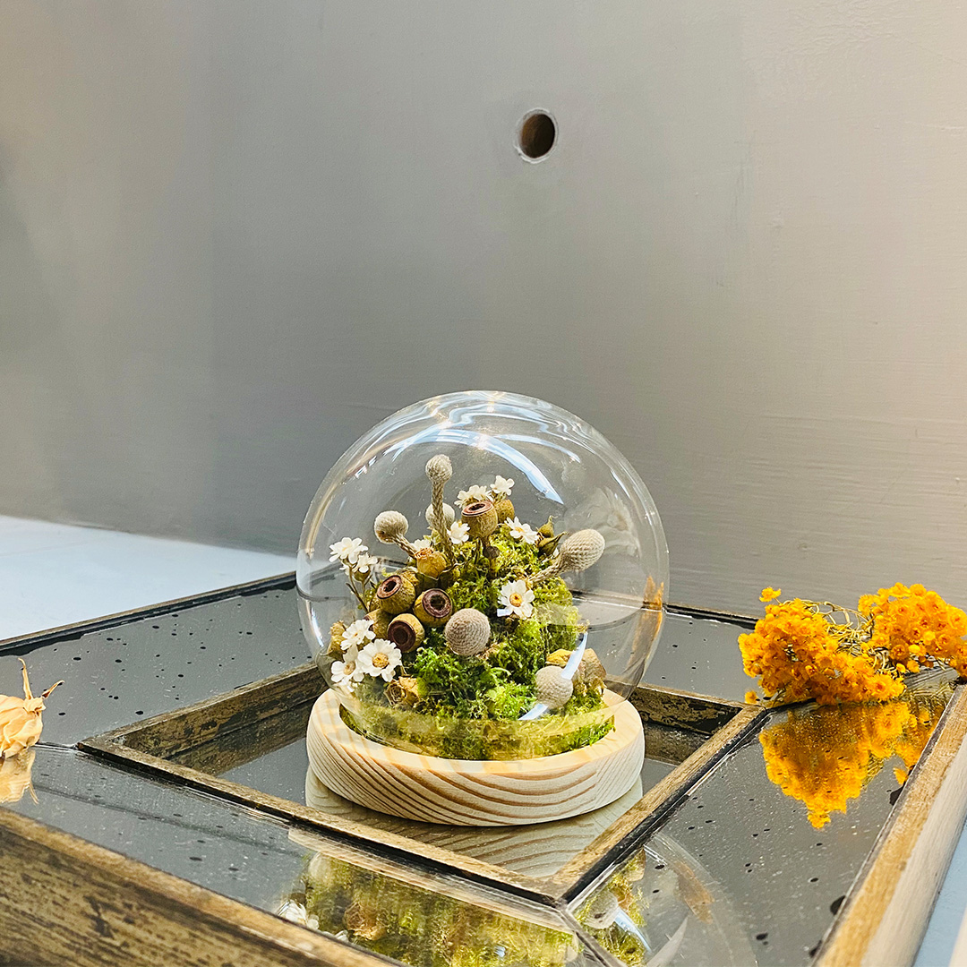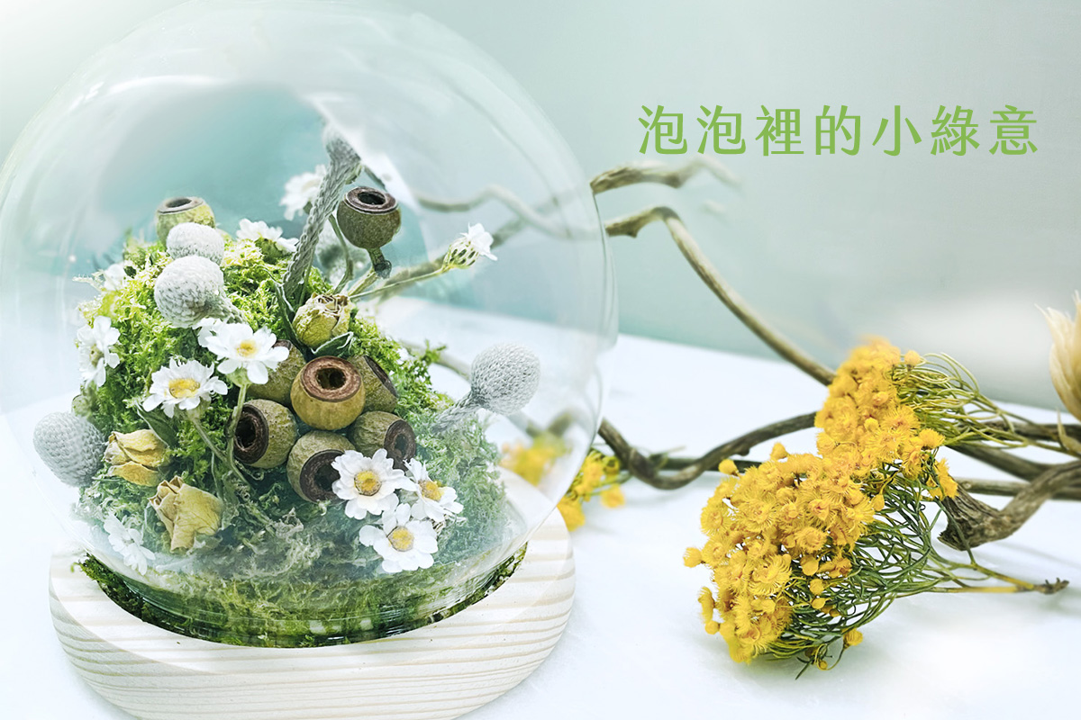 小小星球上面有屬於你個人的天地,每一花、每一草都是你用心灌溉。手作過程中親聞苔草的清香,不自覺令人放鬆,就像回歸大自然般,有著平靜溫暖的感覺。 泡泡裡的世界代表了家園也代表了生態,時刻提醒我們守護的責任。