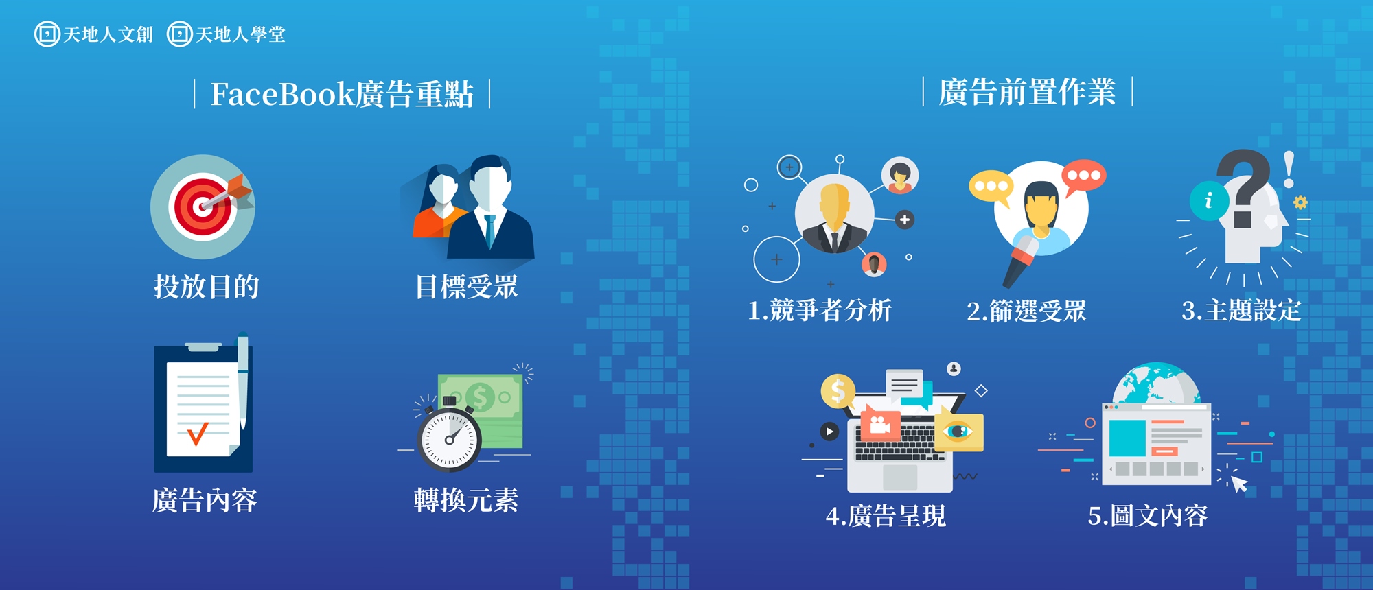 業師將介紹Facebook十大免費工具,其中涵蓋–搜尋競爭者廣告、各國廣告案例、廣告落地呈現方式、製作FB貼文、免費圖庫/影片庫模板設計工具、FB受眾行為類別與人數規模、廣告策略資源工具,協助你快速製作高質感的行銷廣告。有鑑於此,天地人文創旗下天地人學堂特地規劃出「從無到有製作你第一個Facebook廣告。Facebook廣告新手入門暨十大分析工具研習班:從基礎廣告、競品追蹤、圖文工具,到廣告實作演練」,邀請到國家級服務業研發智庫–商業發展研究院電商組長,業師曾任職美國500強企業、擔任阿里巴巴成功營導師、台北市新貿獎評審、輔導Disney、Epson、寶成、東森國際等多家大型企業,此堂課程濃縮精華,以多年扎實的實務經驗由淺入深地全面剖析FB廣告的七大核心技巧:(1)FB廣告原理介紹;(2)如何分析競爭者;(3)廣告主題設定;(4)如何讓廣告具備說服力;(5)引人入勝的圖文內容;(6)篩選專屬目標受眾;(7)其他資源工具。透過這門課程,幫助你掌握FB廣告十大工具的實戰經營技巧與Know-how。