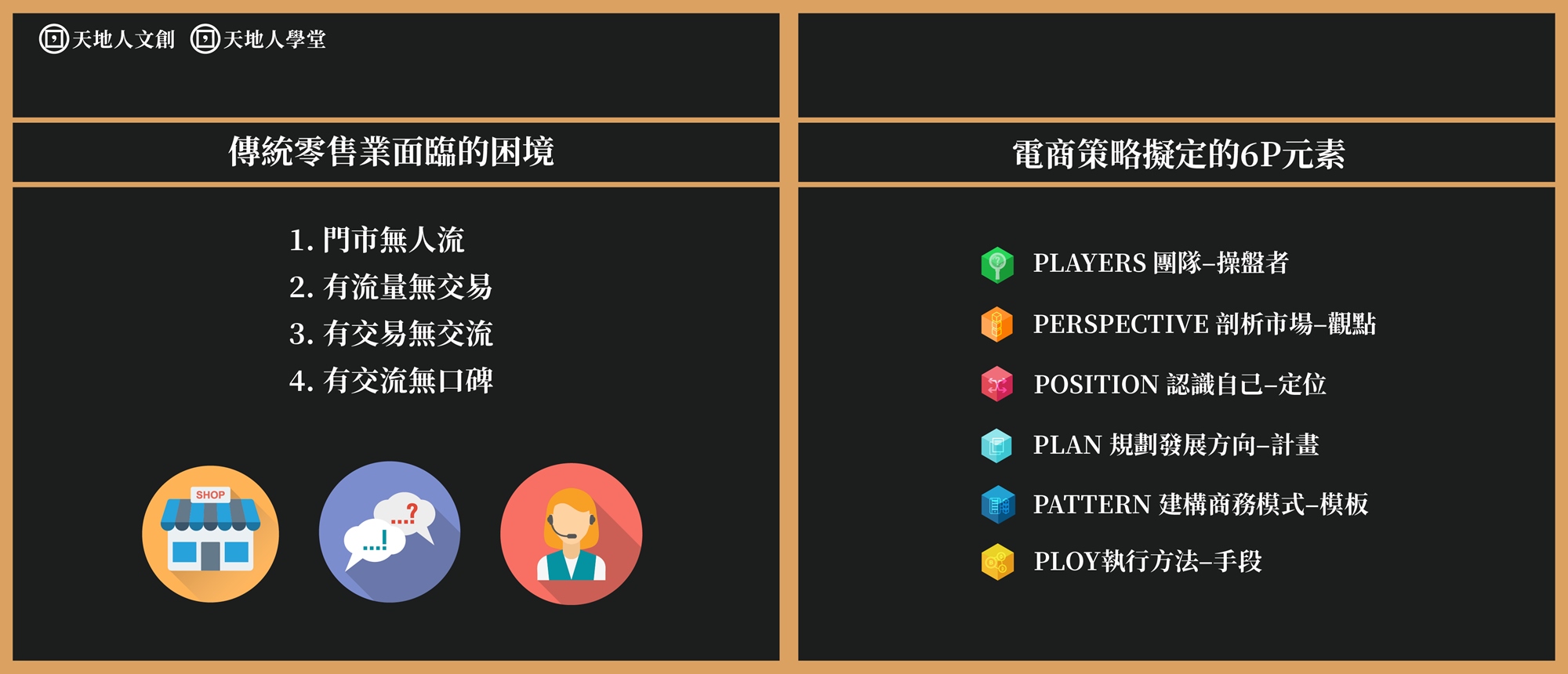 從流量、轉換率、客單價便可知曉營收數字,如何將客戶流量轉變成長久的會員經營是未來白熱化電商市場的經營關鍵。有鑑於此,天地人文創旗下天地人學堂特地規劃出「老闆的電子商務第一堂課|從電商基礎、網路營運管理、全通路接點與會員經營技巧解析實戰」,邀請電商顧問公司總經理親授課程,業師曾為中國百腦匯集團樂營運中心之總經理、91APP 業務發展部資深總監前來授課。在這門課程中將以多年實務經驗深入淺出全面解析電商經營的四大核心技巧:(1)從外行到入門的電子商務之基礎觀念;(2)從零到一的解析電商營運模式;(3)面對電商高度競爭與高數位廣告成本,如何建構會員核心的銷售利基?(4)完整解析電子商務之會員營銷與數據分析的實戰操作。透過這門課程協助你從無到有瞭解電商營運操作與Know-how。