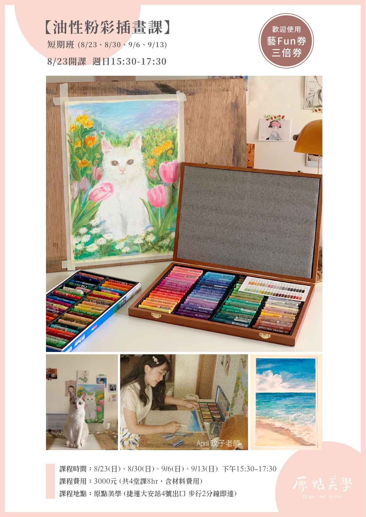 本次以浪漫的花草、貓咪、海洋為主題,即使沒有基礎,一步驟、一步驟教學,針對每位學員給予不同指導,初學也不怕~~歡迎一起來畫圖分享!體會油性粉彩的堆疊魅力!