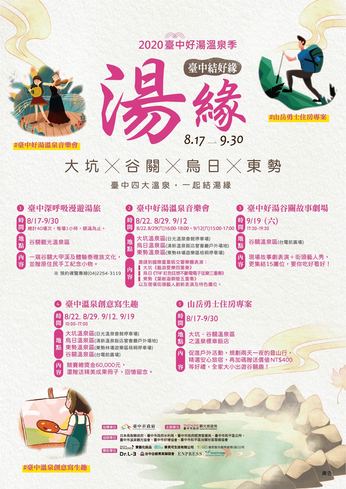臺中有好山好水,也有好湯,臺中四大名湯谷關、大坑、烏日、東勢的優質溫泉遠近馳名,碳酸泉質對皮膚有輕微按摩作用,別稱「美人湯」。為了推廣臺中溫泉,臺中市政府觀光旅遊局於8/17-9/30舉辦「2020臺中好湯溫泉季」系列活動, 以「湯緣」為主題,邀您來臺中結好緣,幸福泡好湯!
