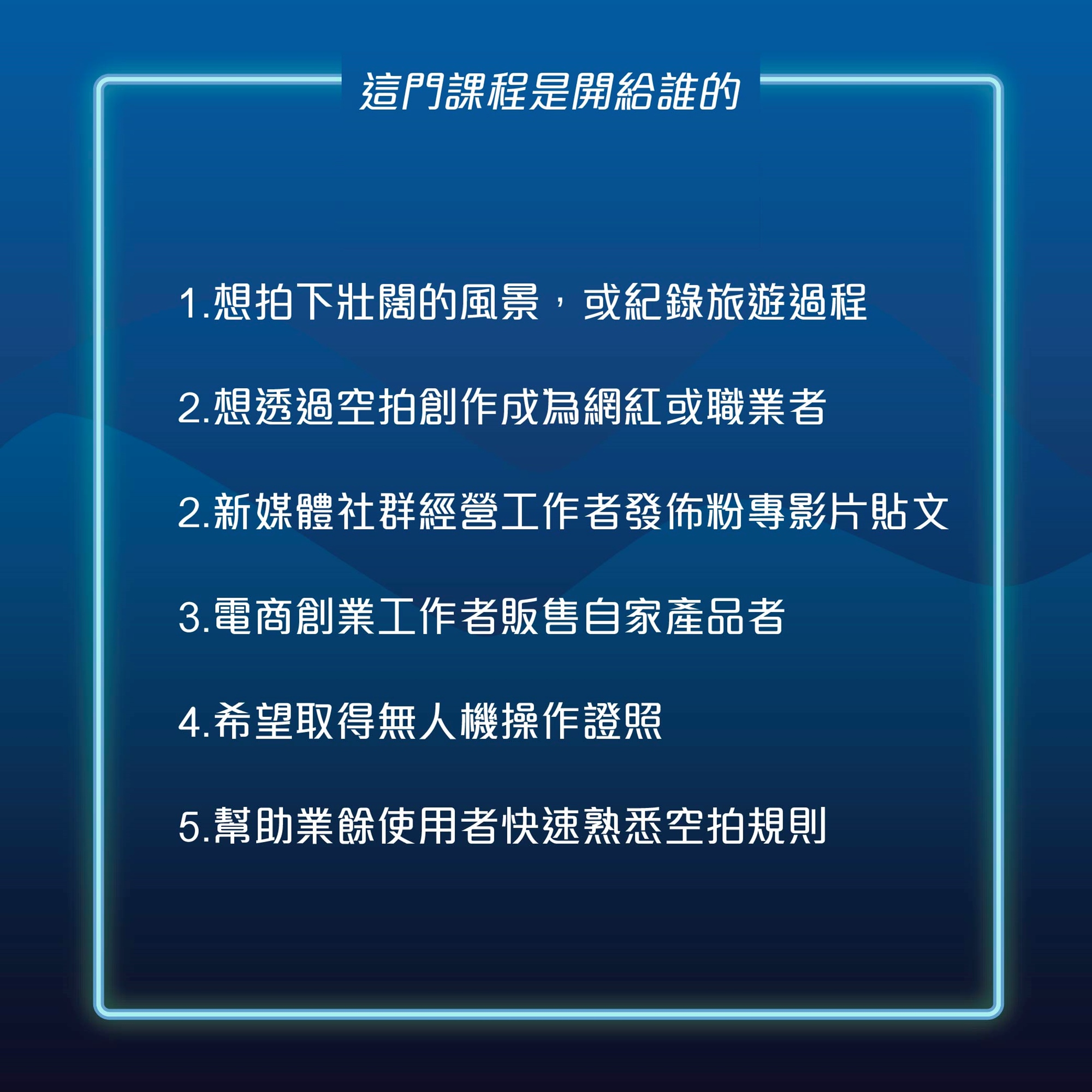 飛行技巧及安全觀念養成 / 構圖美學運鏡技巧 / 空拍飛行實戰