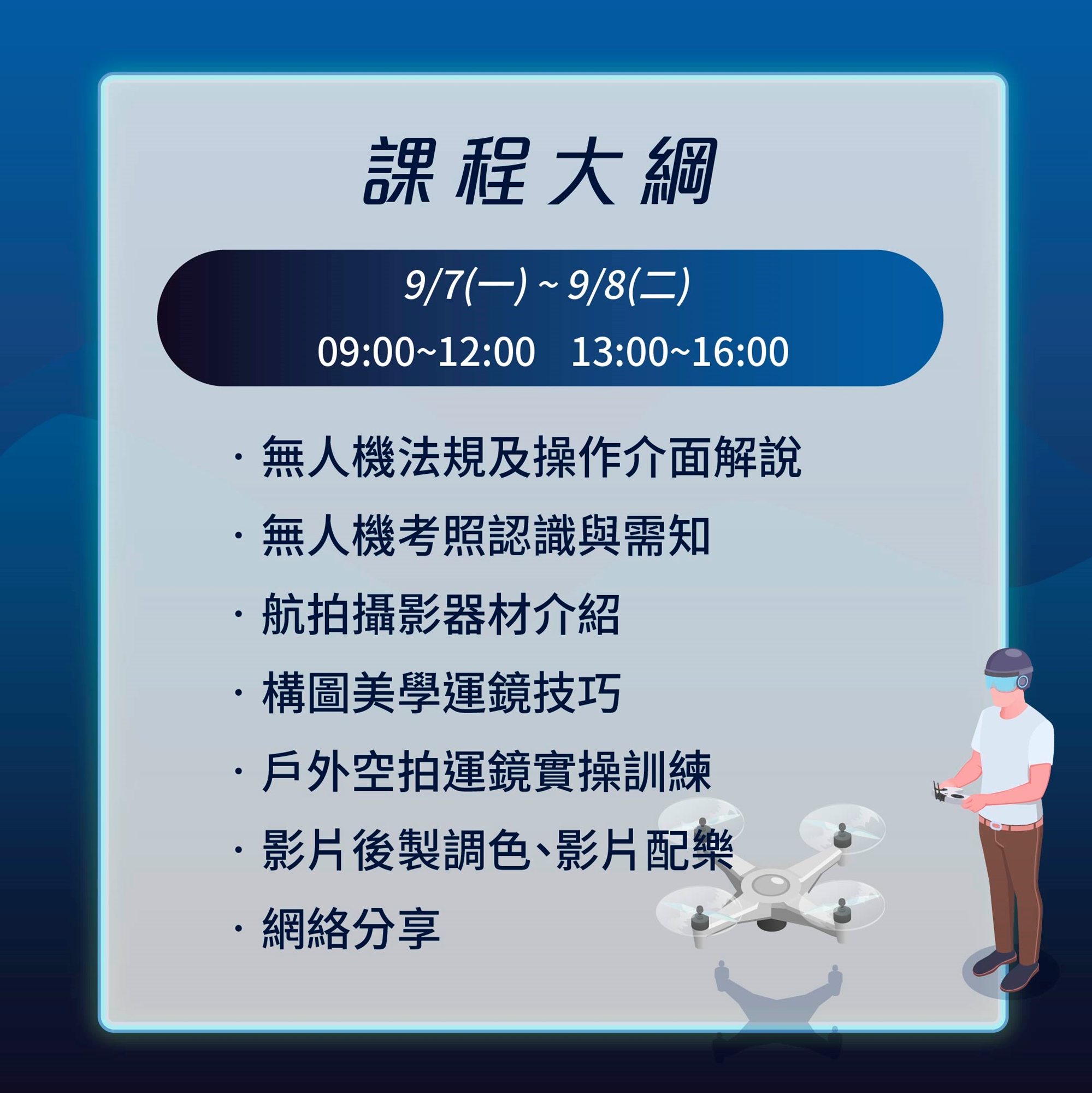 本課程將提供您無人機飛行的觀念以及安全知識,許多人對於遙控空拍機的陌生以及知識的不足,因此對於空拍機又愛又怕,只要具備良好的飛行觀念,讓空拍機成為你空中的攝影機!空拍真的沒你想像的難。