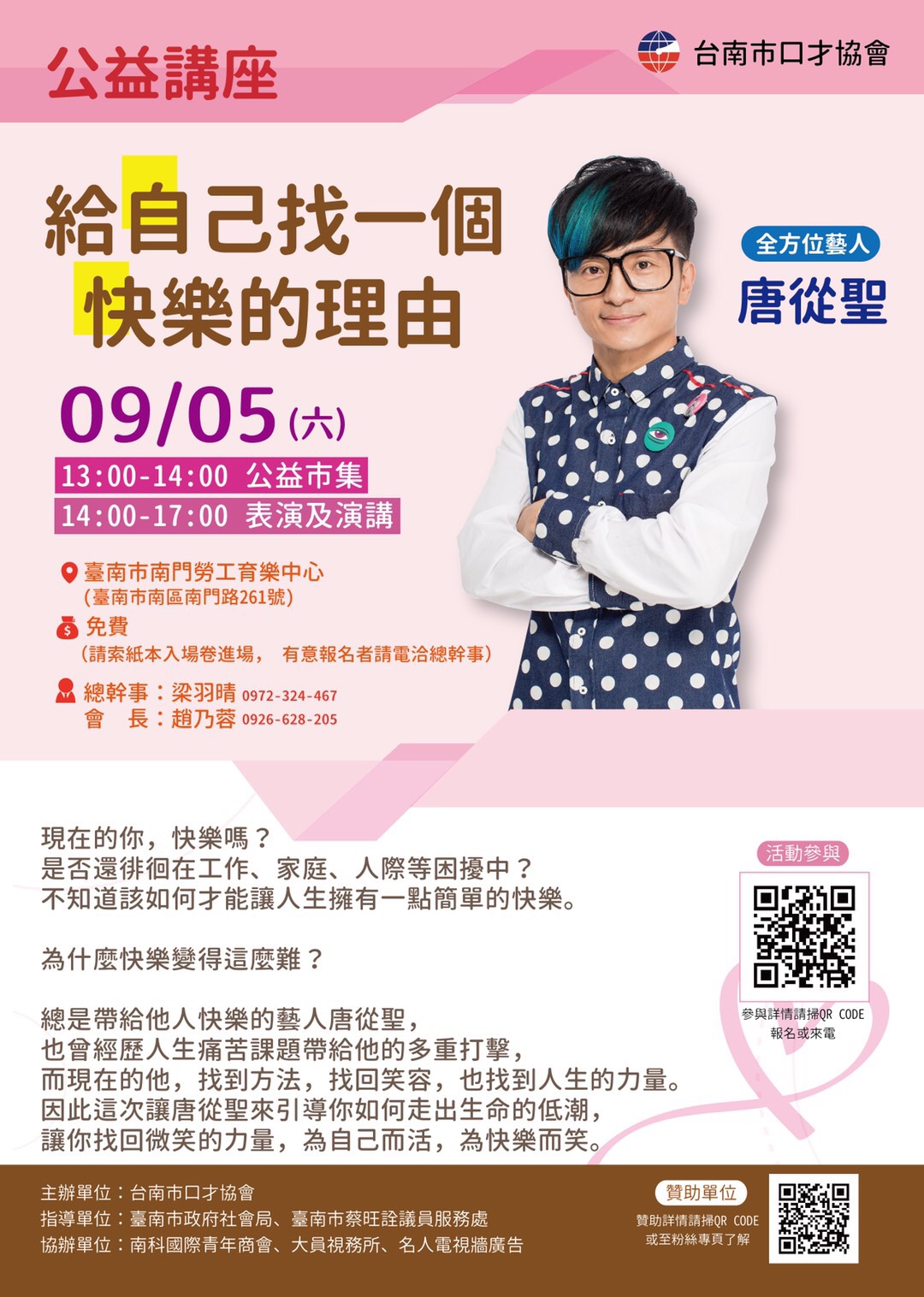 台南市口才協會至今已成立30年,秉持「心想好意、口說好話、身行好事」的宗旨,致力推廣口才藝術的理念,協會透過辦理課程,訓練口語表達能力,並定期舉辦名人講座,提供會員多元及跨領域的學習,強化專業技能及提升職場競爭力!!