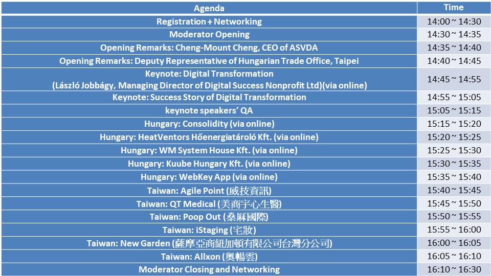 台北市電腦公會(TCA)相當榮幸能與匈牙利貿易辦事處合作,組織了這次混合型網路研討會,以探討數位轉型的重要見解以及科技新創將如何通過不同方式將我們的想像力落實。我們邀請了來自台灣和匈牙利的專家及業界專業人士參加本次活動,和我們分享最新趨勢與發展、投資機會,從國際上引入更多的商業合作機會。誠摯邀請科技界專業人士、風險投資家、跨行業專業人士和新聞媒體與我們共襄盛舉!