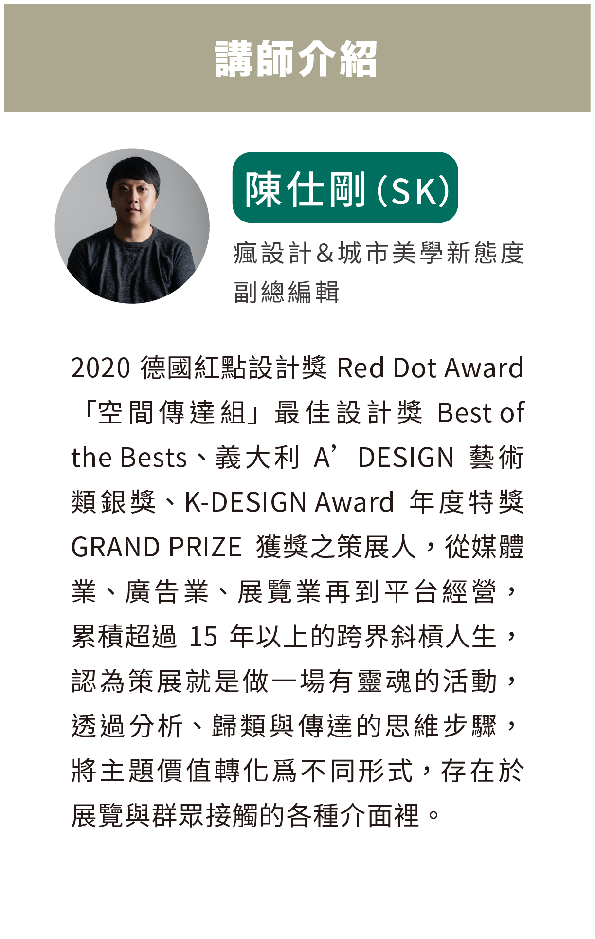 以全球首個膠帶主題特展「聚膠行動 #TapeArt」,拿下義大利A’ DESIGN AWARD 年度藝術類銀獎、德國紅點設計獎2020 Best of the Best以及韓國K-Design GRAND特獎的策展人 陳仕剛 ,整理歸納其多年特展業界經驗與實操心法,專業剖析 做展覽 的眉眉角角,帶你認識展覽第一線實務工作!