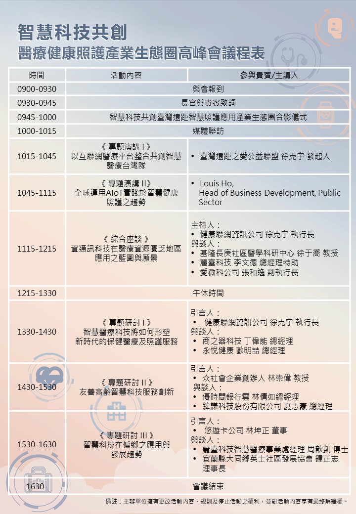隨著AI科技應用話題持續延燒,各政府、民間單位,皆將智慧科技應用視為未來發展重點標的。臺灣遠距智慧之愛公益聯盟攜手亞馬遜網路服務(Amazon Web Services, Inc., AWS)等科技廠商共同合作,深耕臺灣智慧醫療照護領域,並帶頭成立產業生態圈。為展示生態圈運作成果,聯盟於本(109)年9月14日假臺大醫院國際會議中心,舉辦「智慧科技共創醫療健康照護產業生態圈」高峰會議。本次會議邀請多位貴賓以及國內、外資通訊廠商共同參與,瞭解目前生態圈應用現況,並研討產業平台發展下一步。