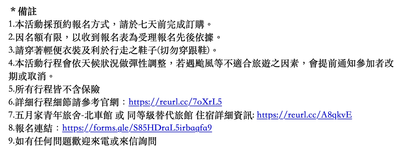 2. 請於一週前報名,以利安排行程及導覽人員